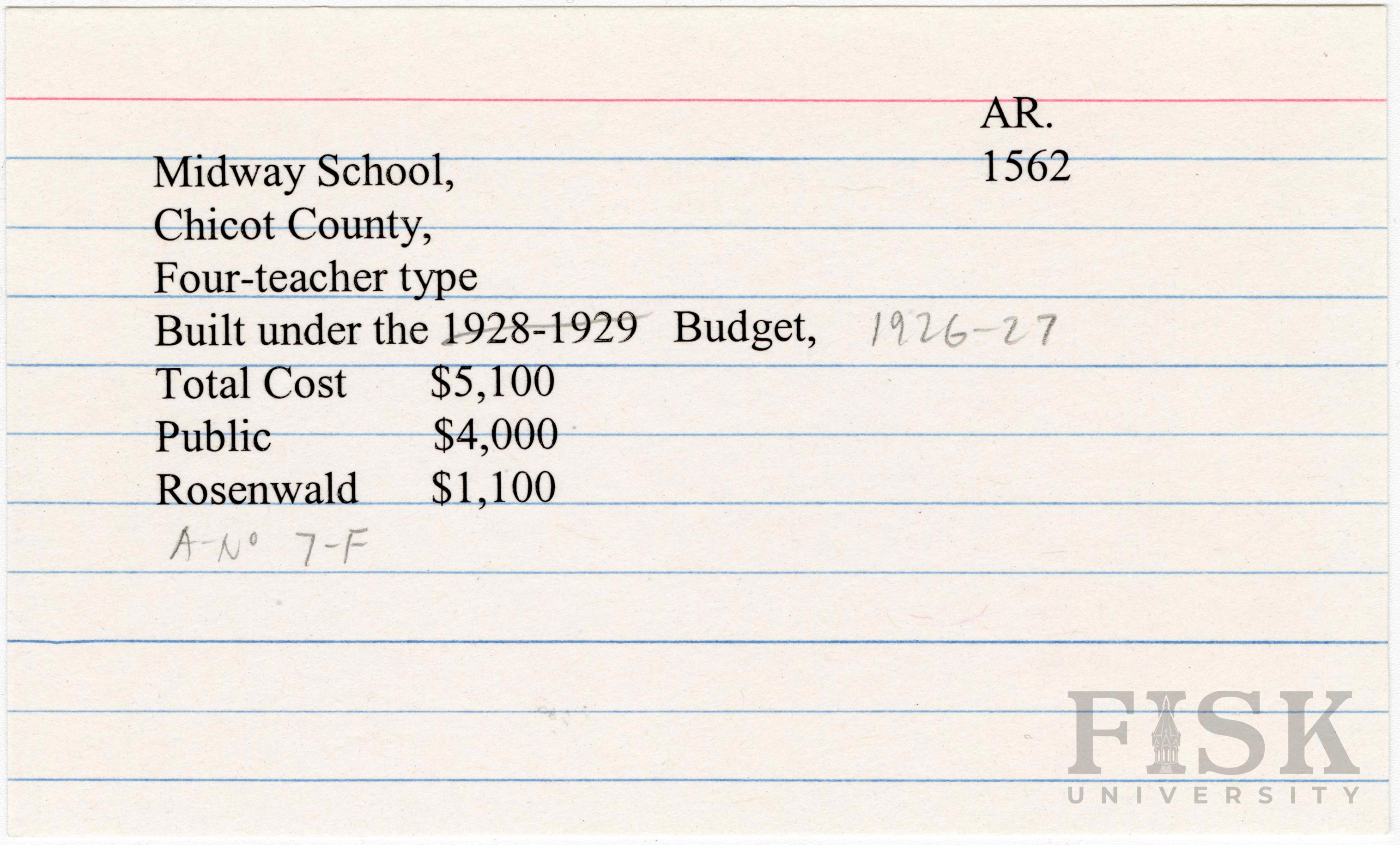 School card from Rosenwald Fund for Midway School in Chicot County, Arkansas with a handwritten correction to the budget year section