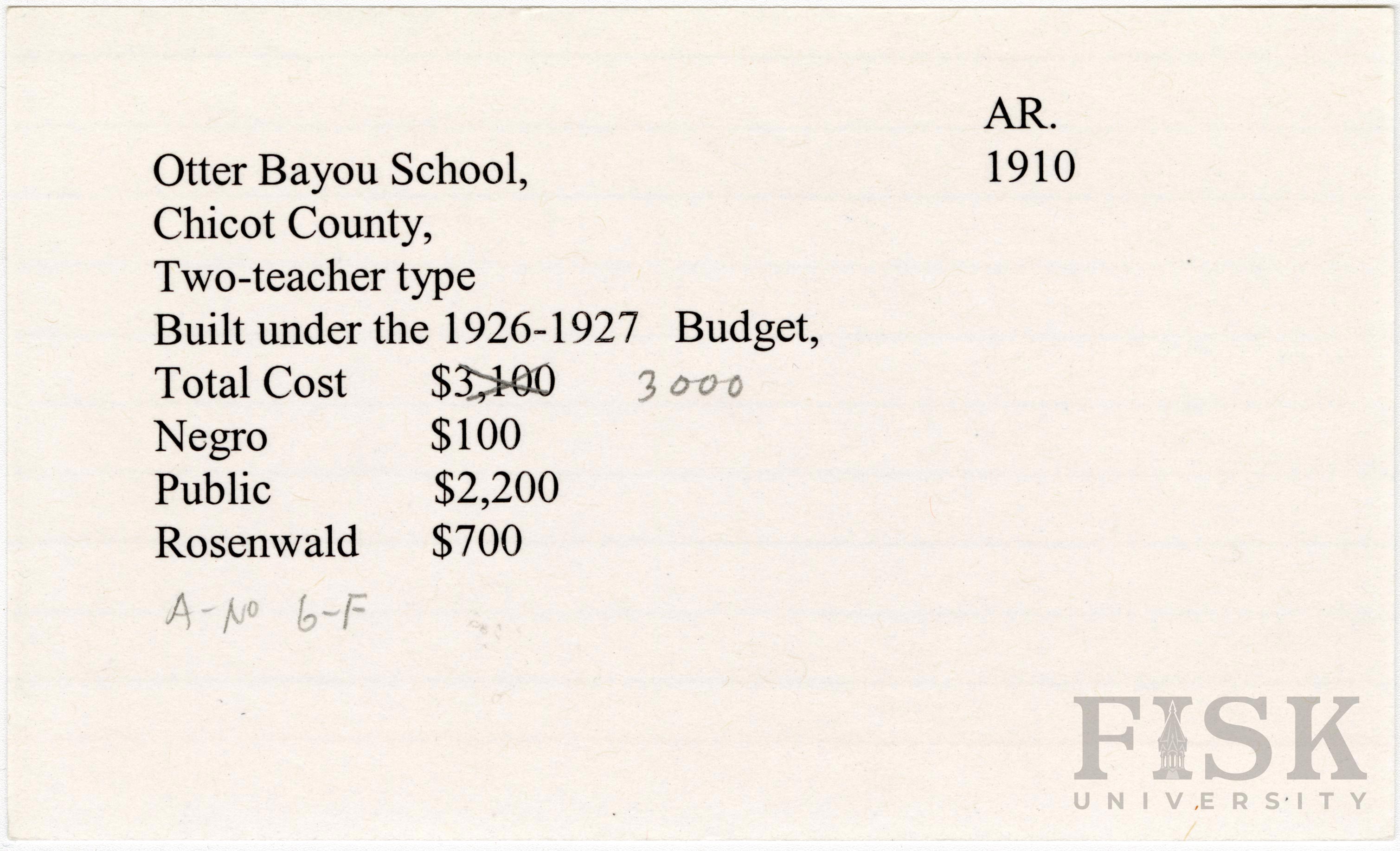 School card from Rosenwald Fund for Otter Bayou School in Chicot County, Arkansas with a handwritten correction to the total cost budget contribution section