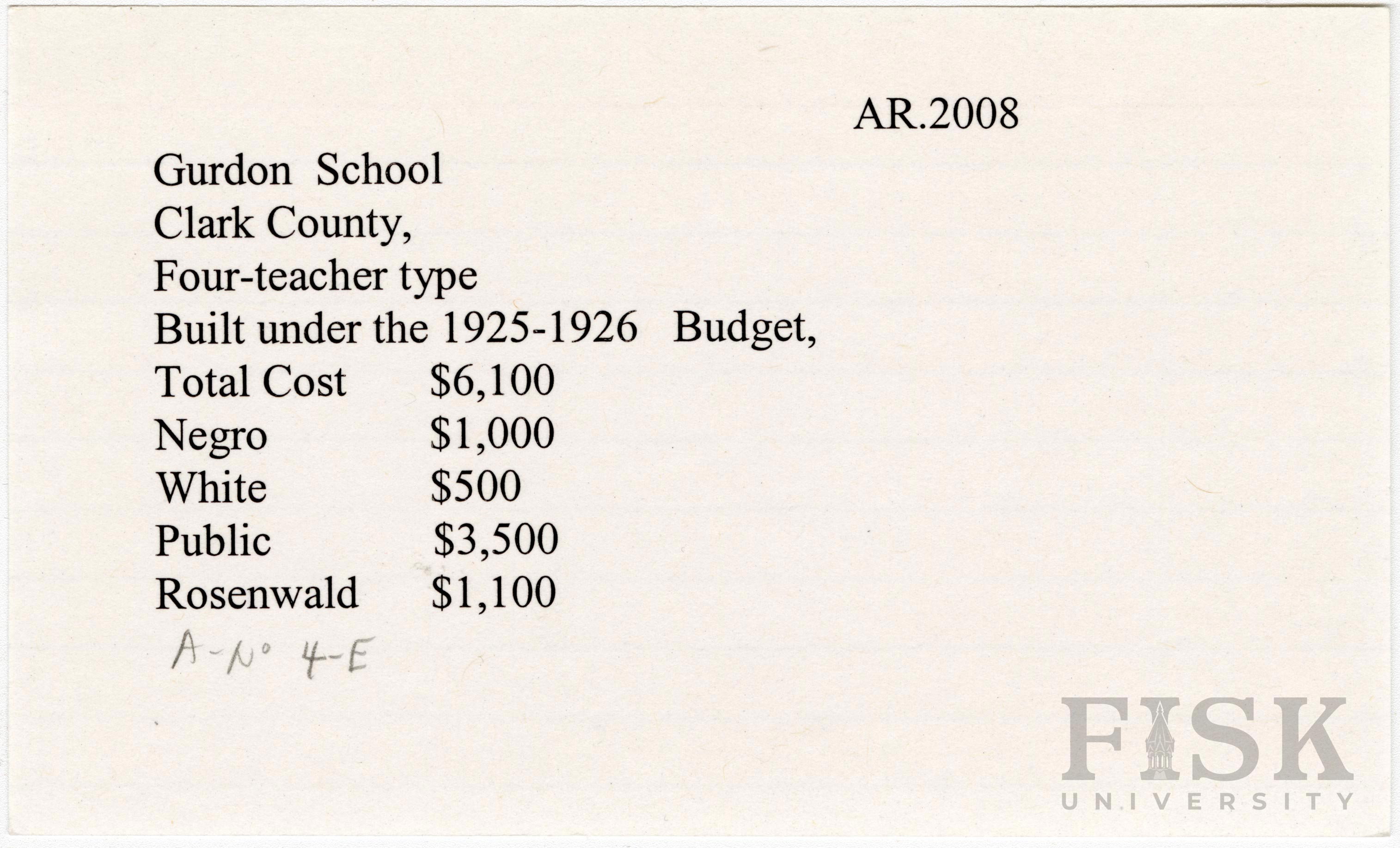 School card from Rosenwald Fund for Gurdon School in Clark County, Arkansas
