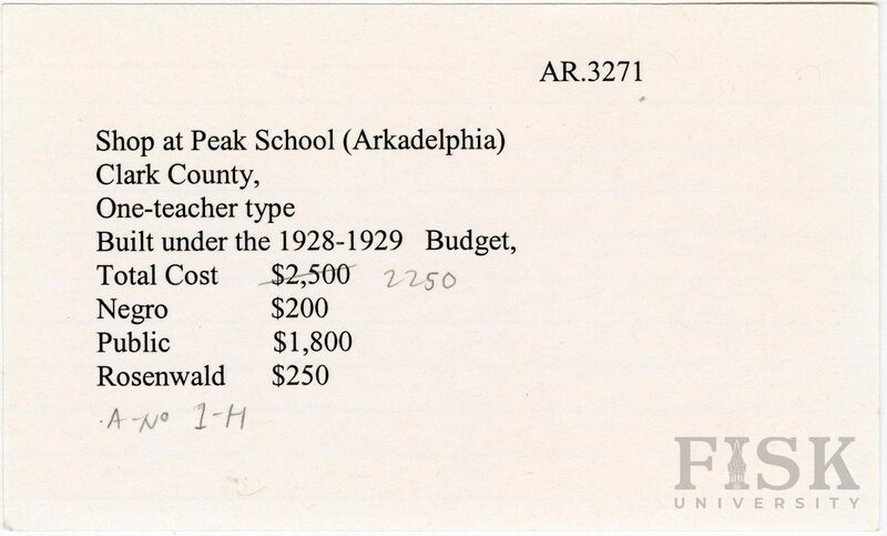 - School card from Rosenwald Fund for the shop at Peake School in Clark County, Arkansas with a handwritten correction to the total cost budget contribution section