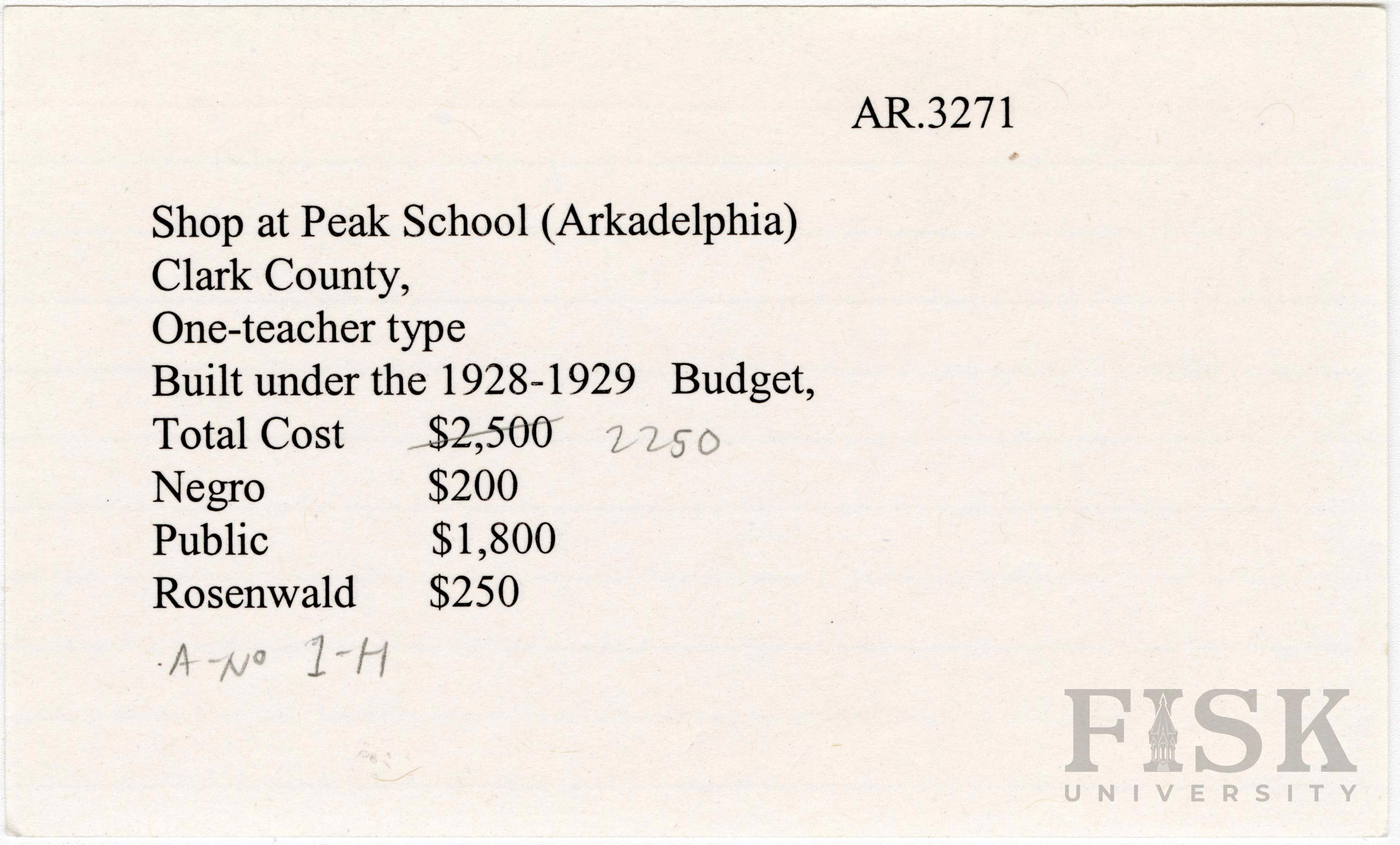 School card from Rosenwald Fund for the shop at Peake School in Clark County, Arkansas with a handwritten correction to the total cost budget contribution section