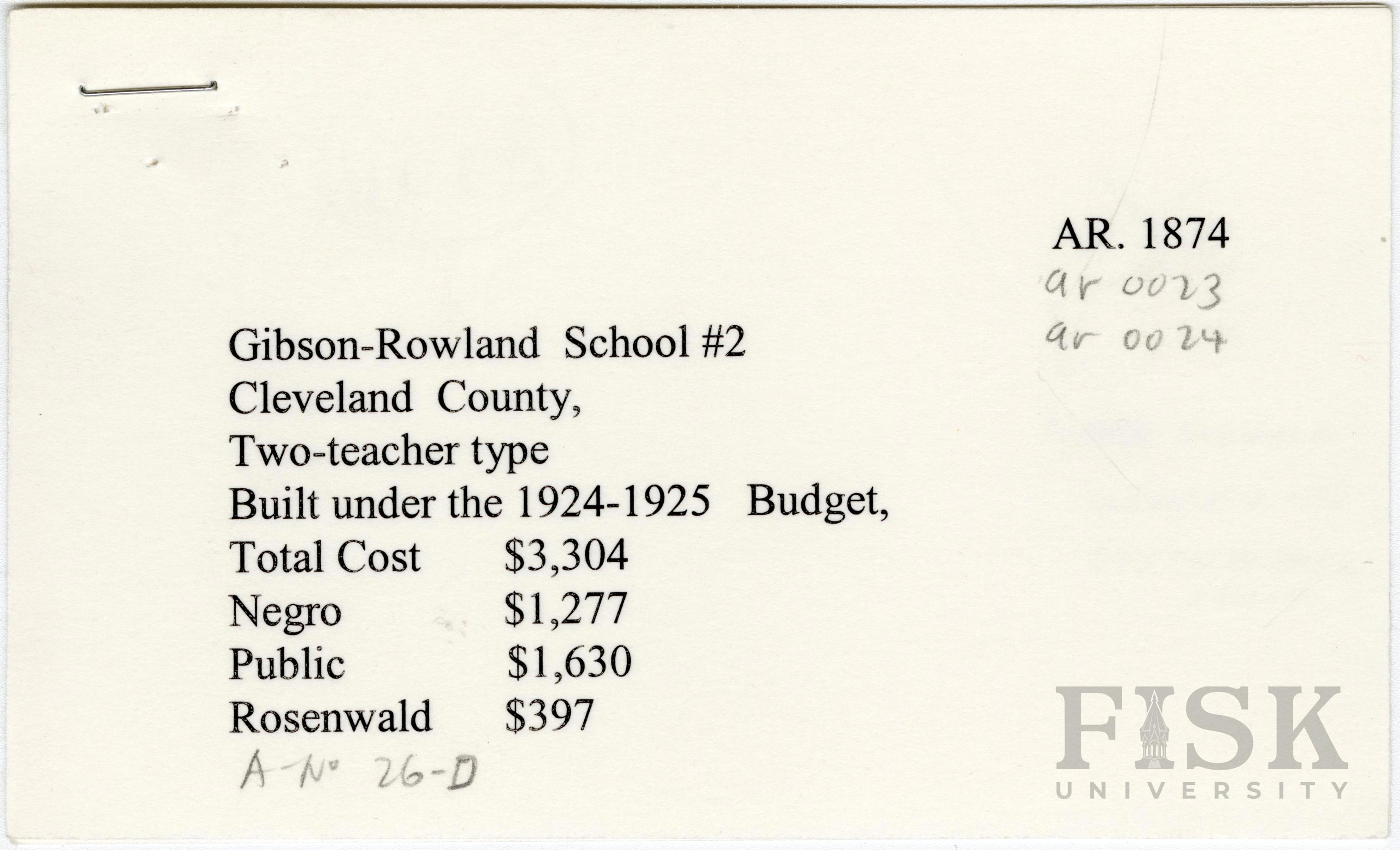 - School card from Rosenwald Fund for Gibson-Rowland School No. 2 in Cleveland County, Arkansas