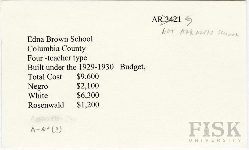 - School card from Rosenwald Fund for Edna Brown School in Columbia County, Arkansas with a correction to the item number that crosses out the item number and says, "Not Arkansas school"
