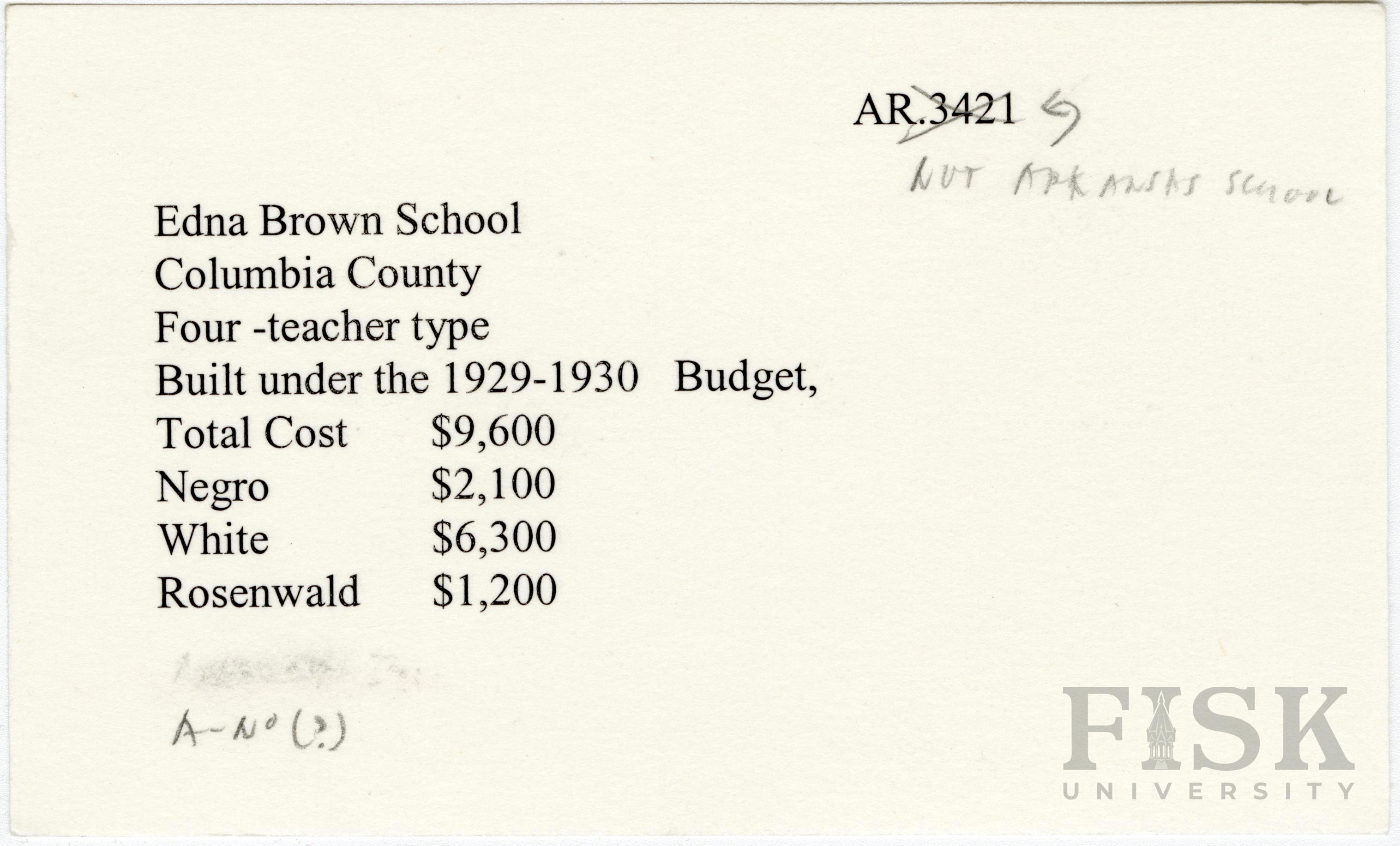 School card from Rosenwald Fund for Edna Brown School in Columbia County, Arkansas with a correction to the item number that crosses out the item number and says, "Not Arkansas school"