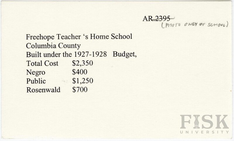 - School card from Rosenwald Fund for the teacher's home at Freehope School in Columbia County, Arkansas with a note next to the item number that says, "Photo only of school"