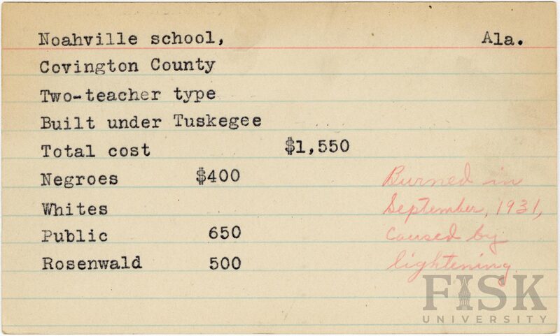 - School card from Rosenwald Fund for Noahville School in Covington County, Alabama with a handwritten note on the right saying, "Burned in September 1931, caused by lightning"