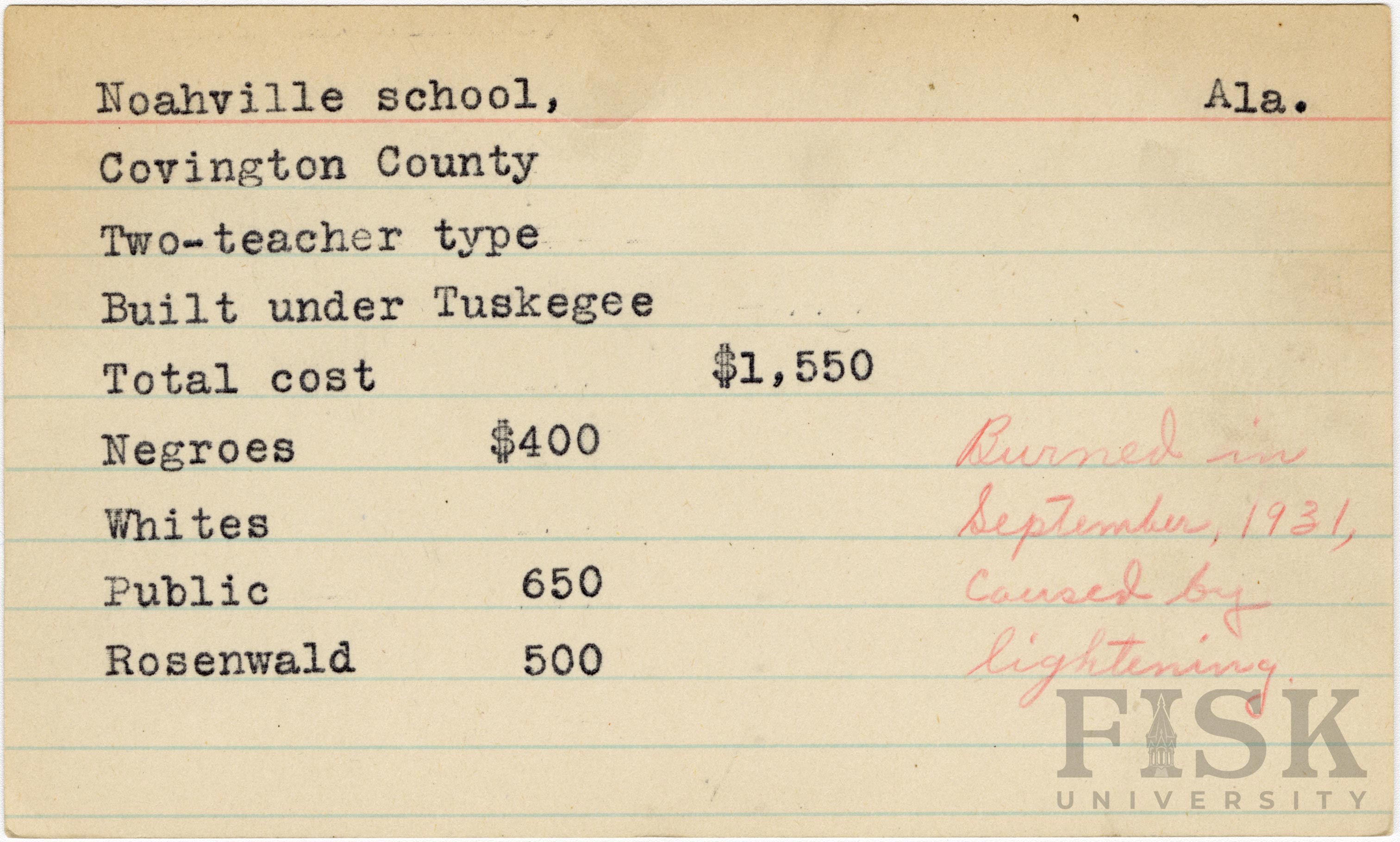 School card from Rosenwald Fund for Noahville School in Covington County, Alabama with a handwritten note on the right saying, "Burned in September 1931, caused by lightning"