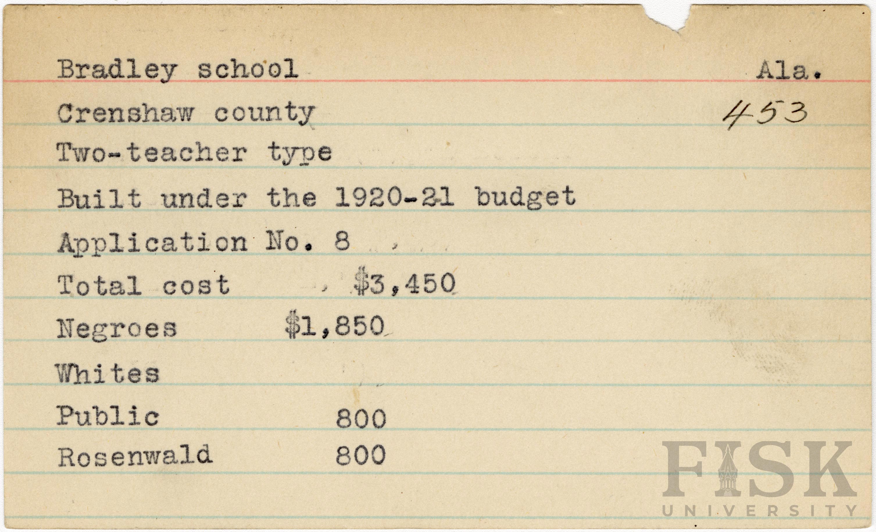 - School card from Rosenwald Fund for Bradley School in Crenshaw County, Alabama