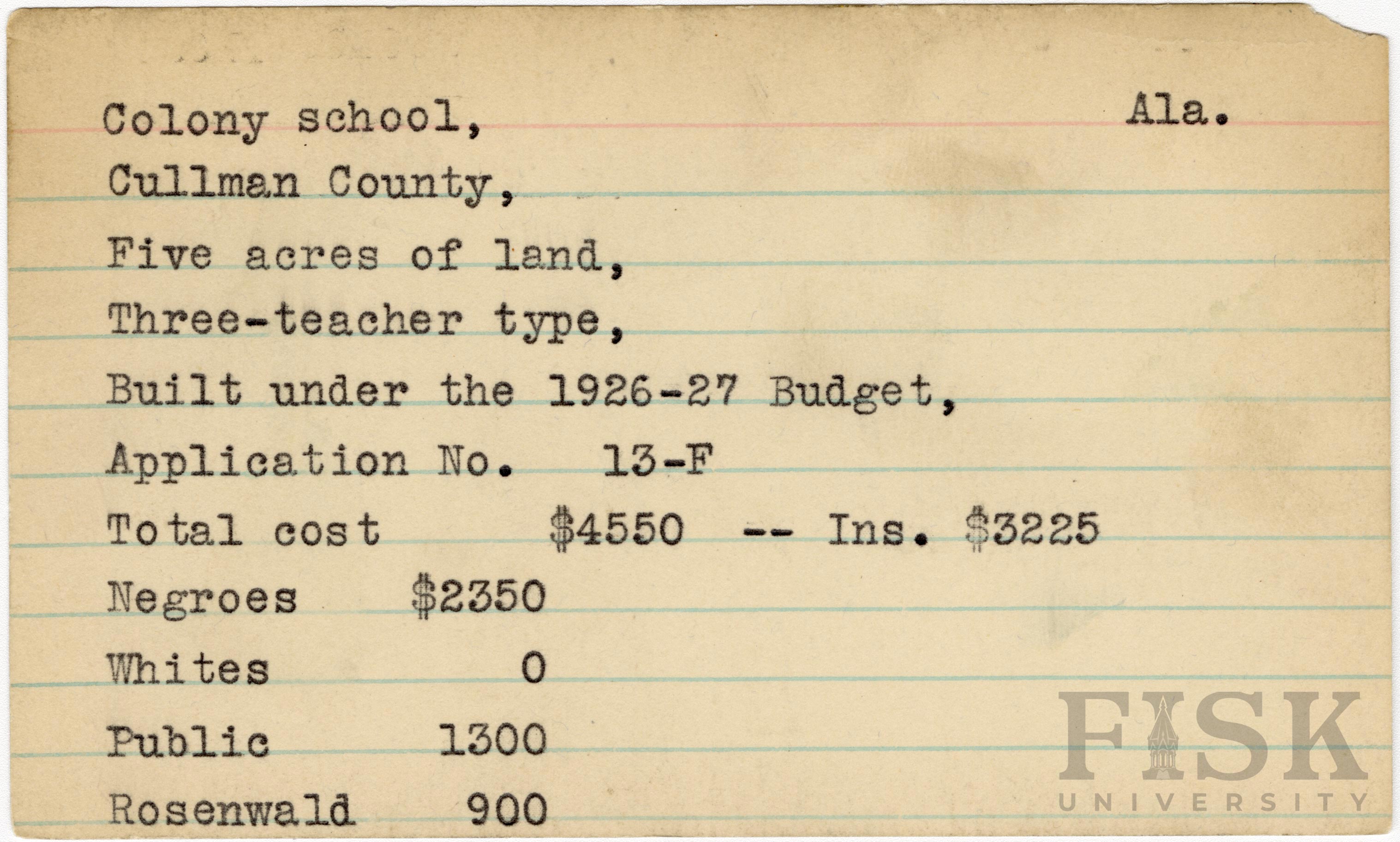 - School card from Rosenwald Fund for Colony School in Cullman County, Alabama with a section added to the budget contributions that says, "Ins. $3,225"