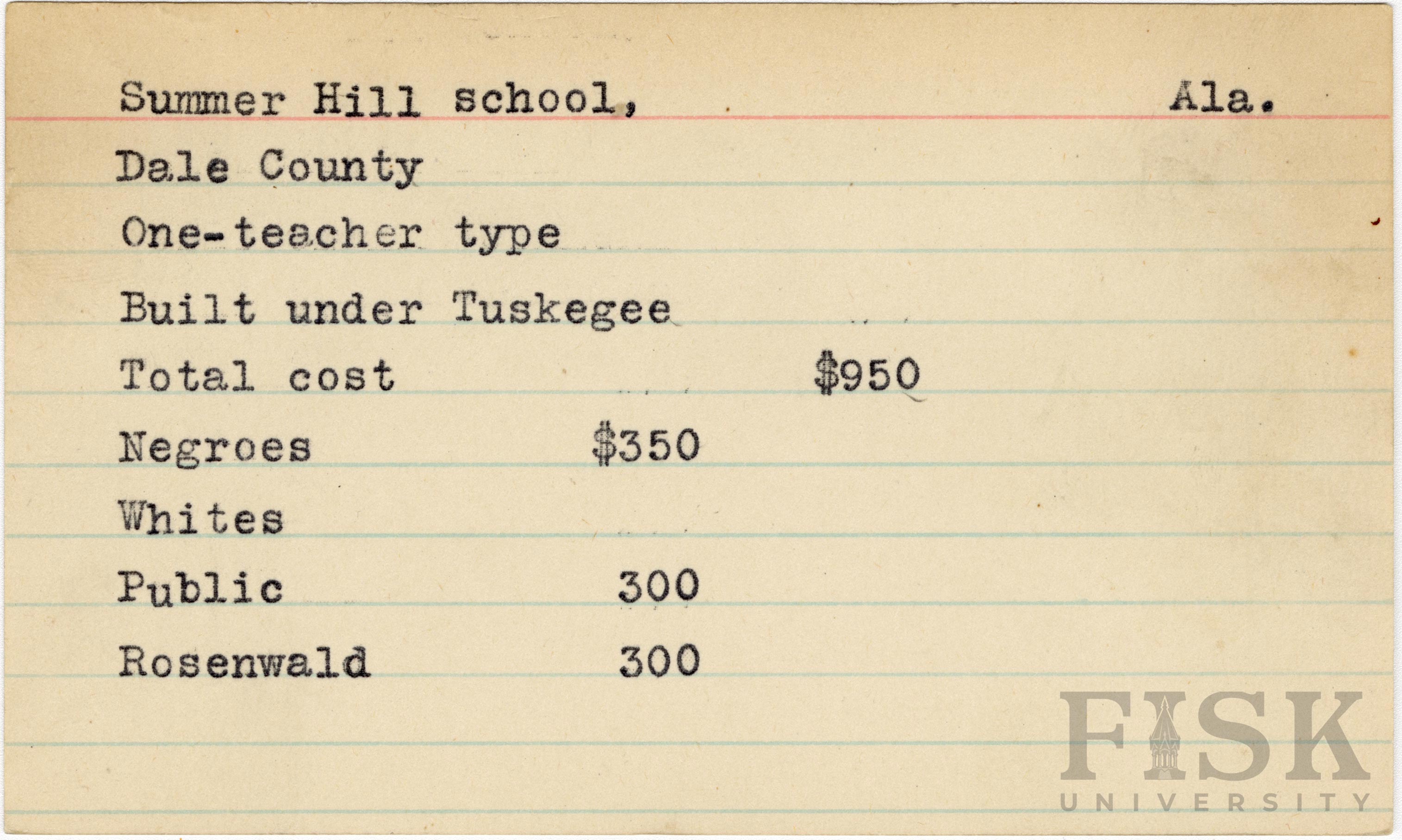 - School card from Rosenwald Fund for Summer Hill School in Dale County, Alabama