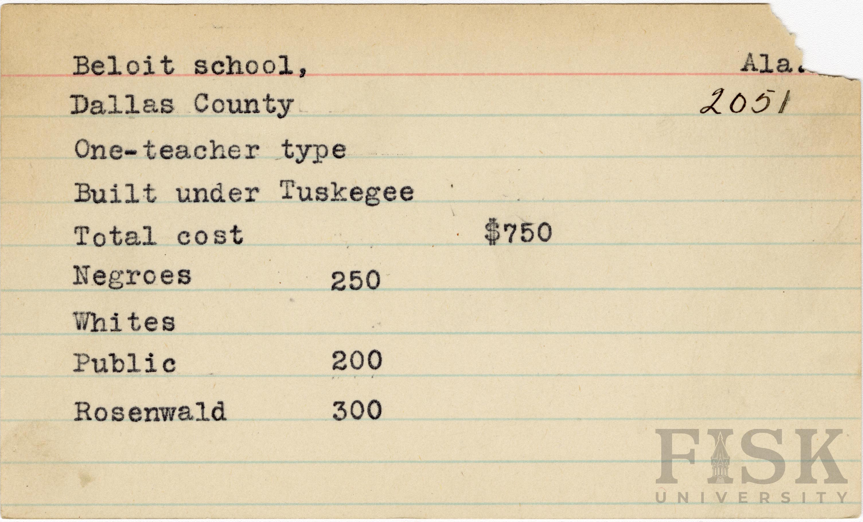 - School card from Rosenwald Fund for Beloit School in Dallas County, Alabama