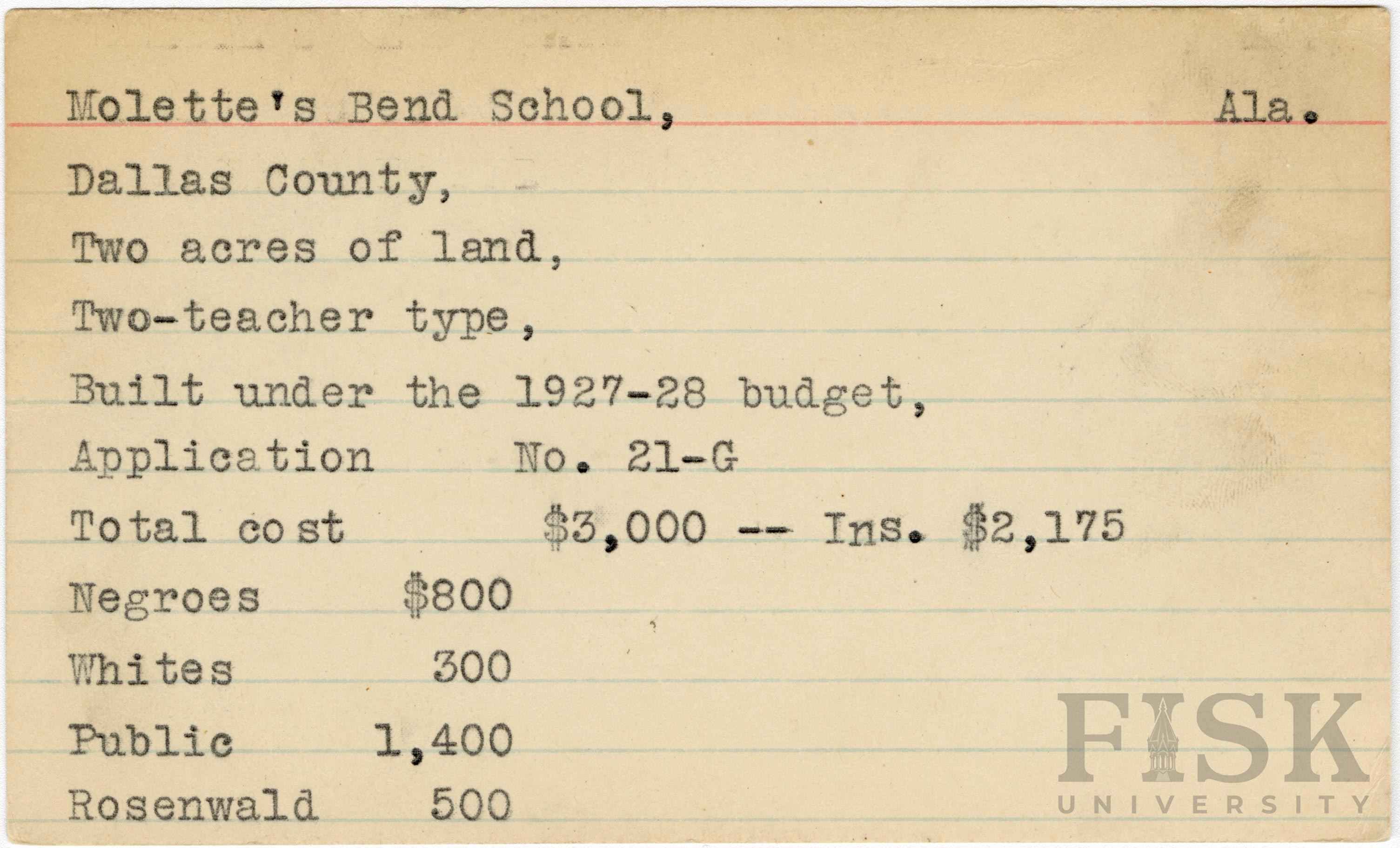 School card from Rosenwald Fund for Molette's Bend School in Dallas County, Alabama with a section added to the budget contributions that says, "Ins. $2,175"