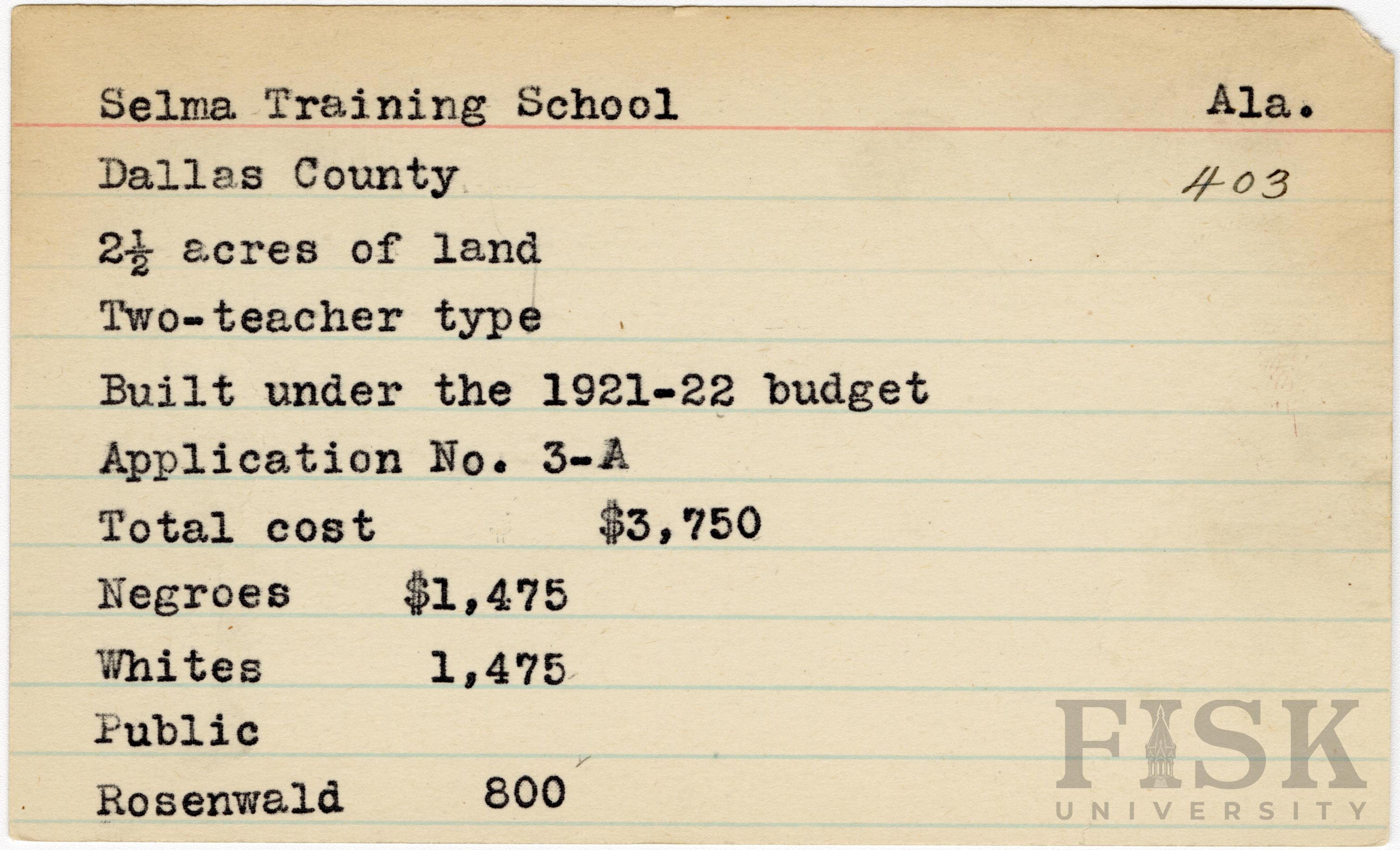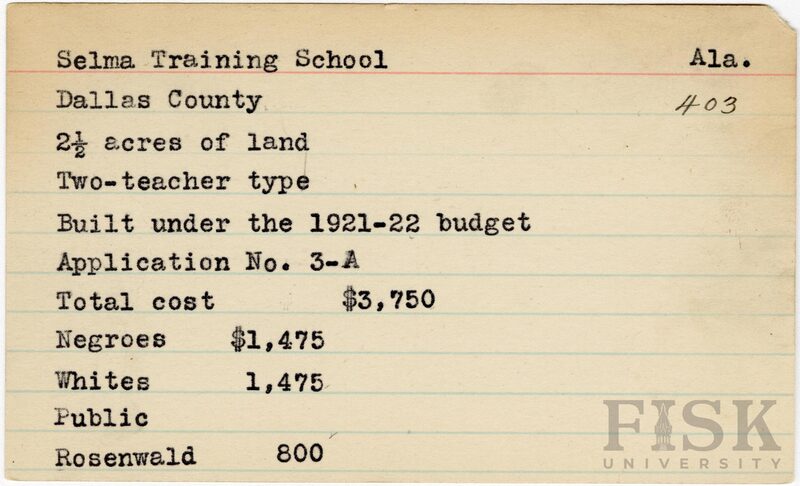 - School card from Rosenwald Fund for Selma Training School in Dallas County, Alabama