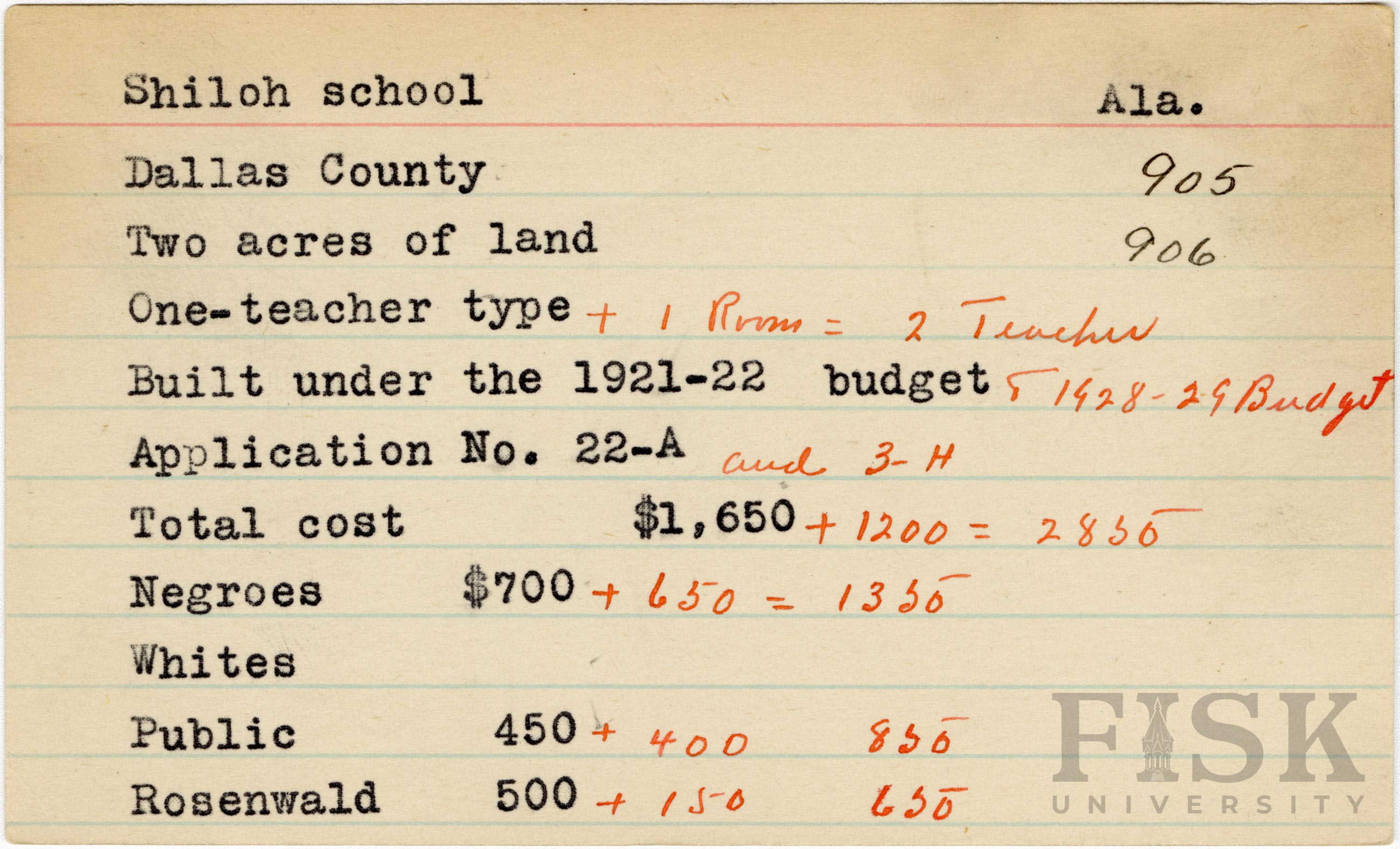 - School card from Rosenwald Fund for Shiloh School in Dallas County, Alabama with handwrittens additions to the teacher type, budget year, application number, and budget contribution sections