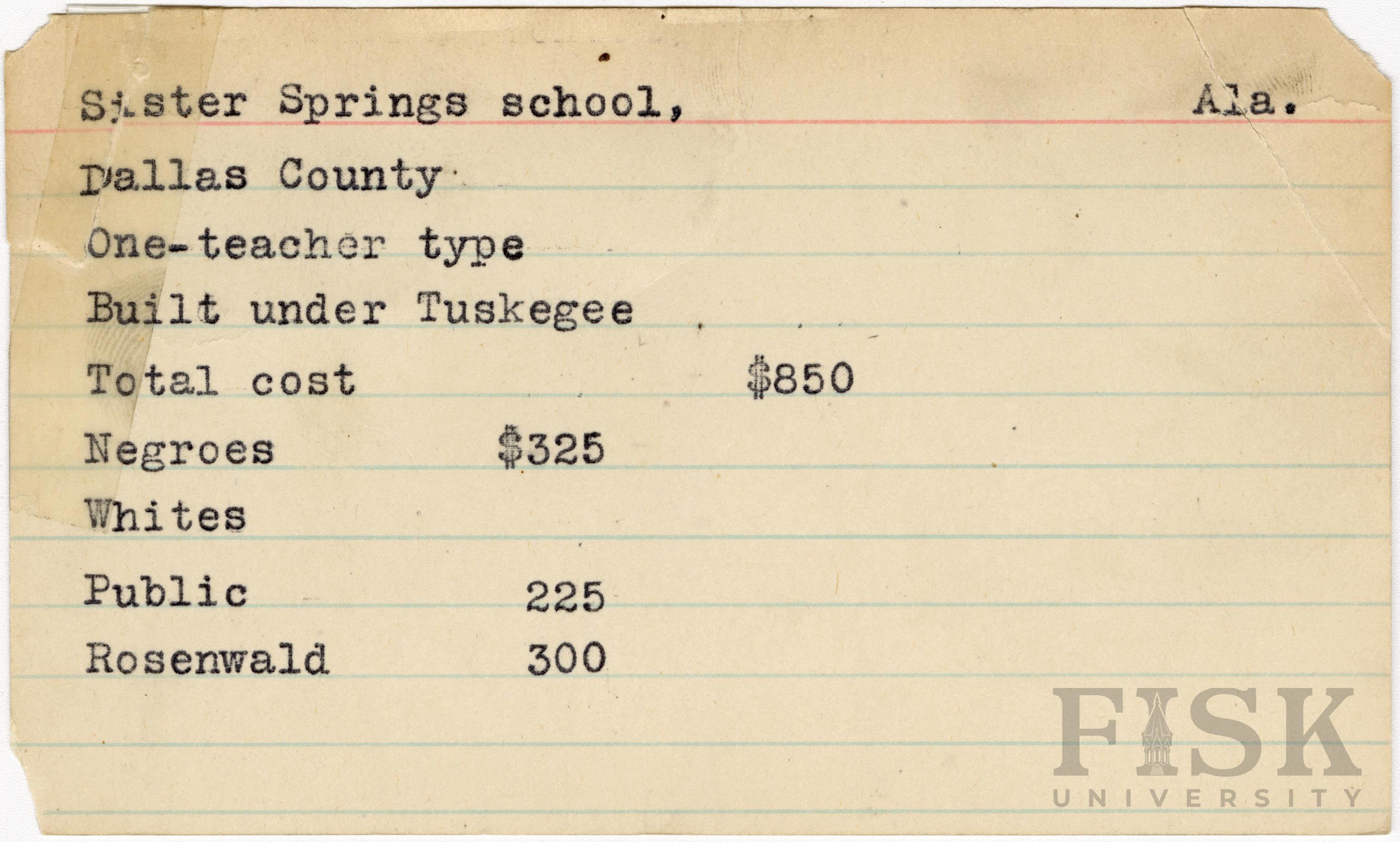 - School card from Rosenwald Fund for Sister Springs School in Dallas County, Alabama
