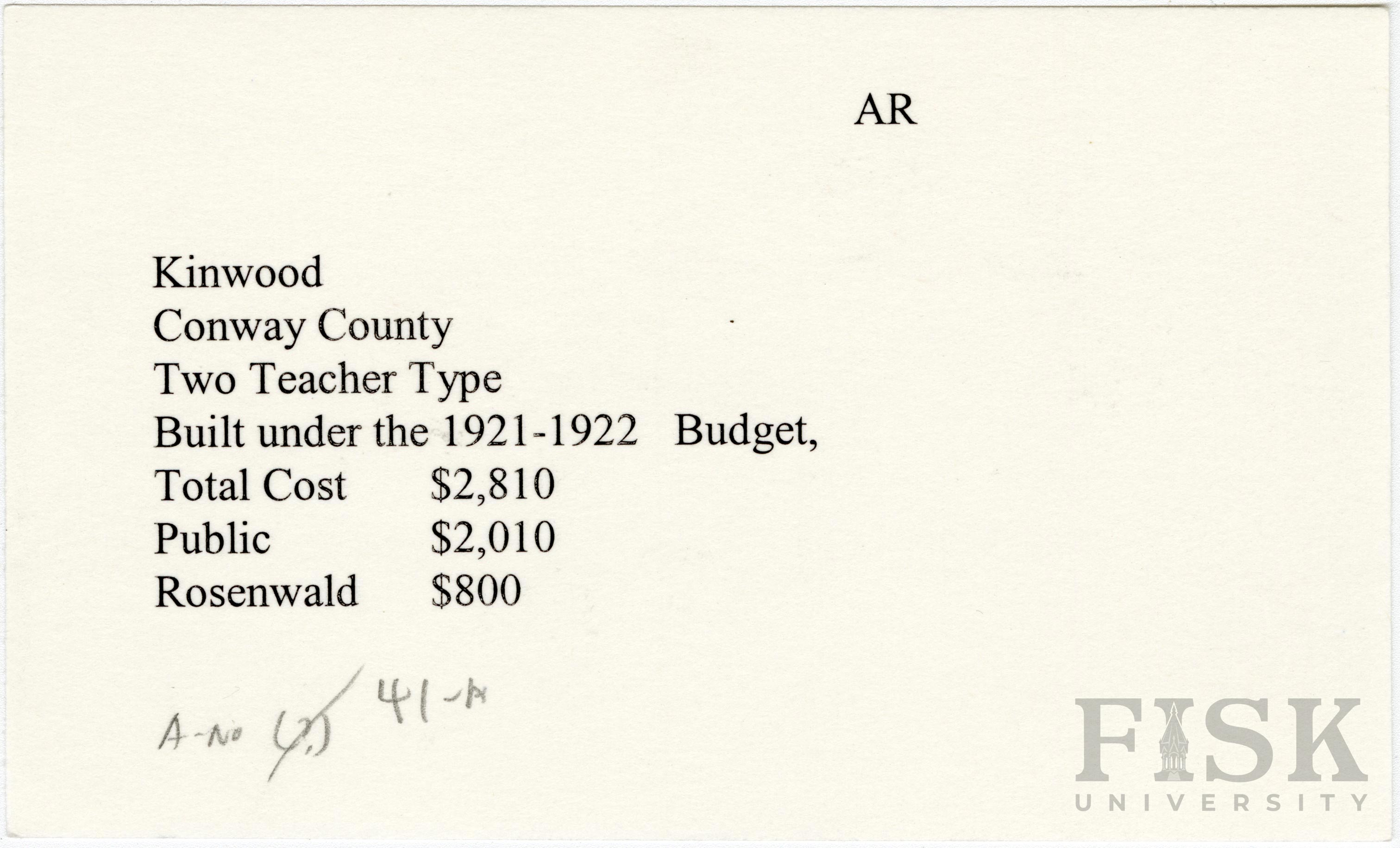 School card from Rosenwald Fund for Kinwood School in Conway County, Arkansas