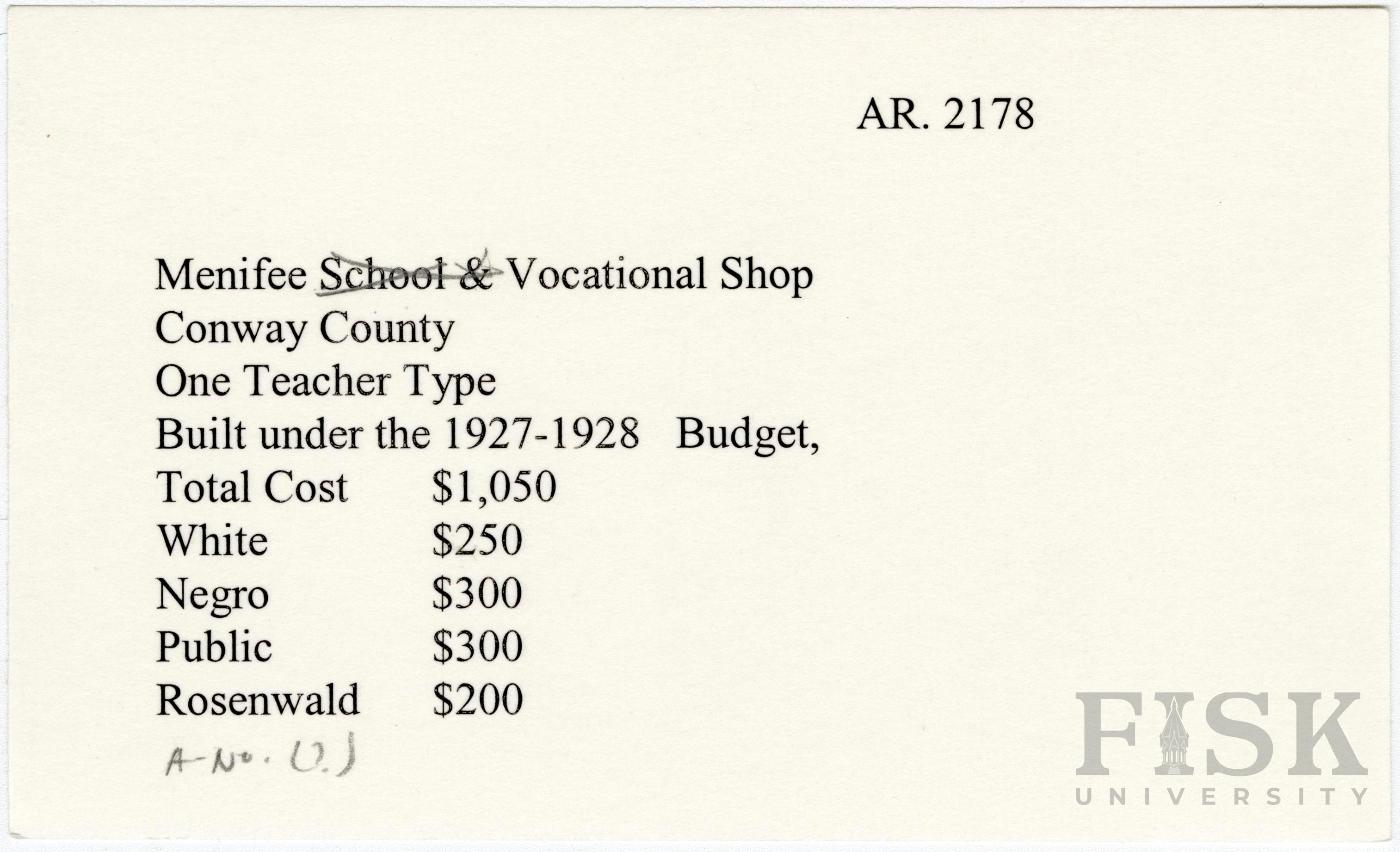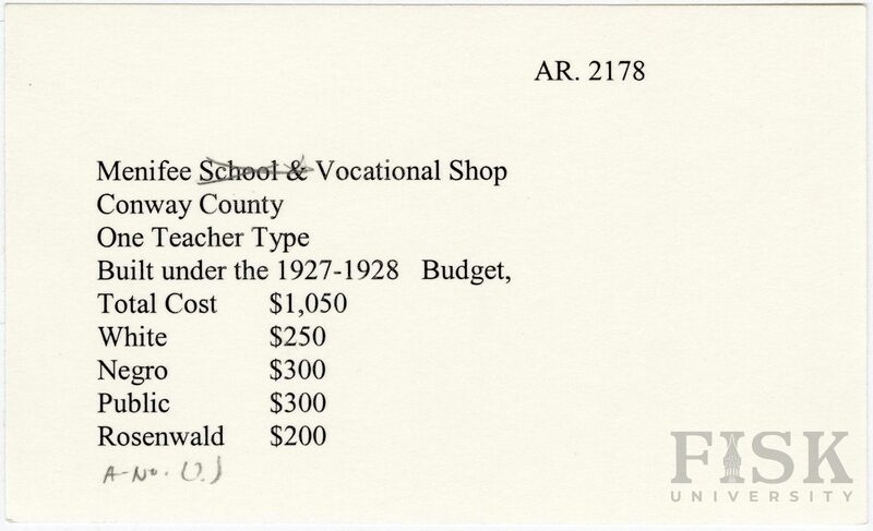 - School card from Rosenwald Fund for the vocational shop at Menifee School in Conway County, Arkansas