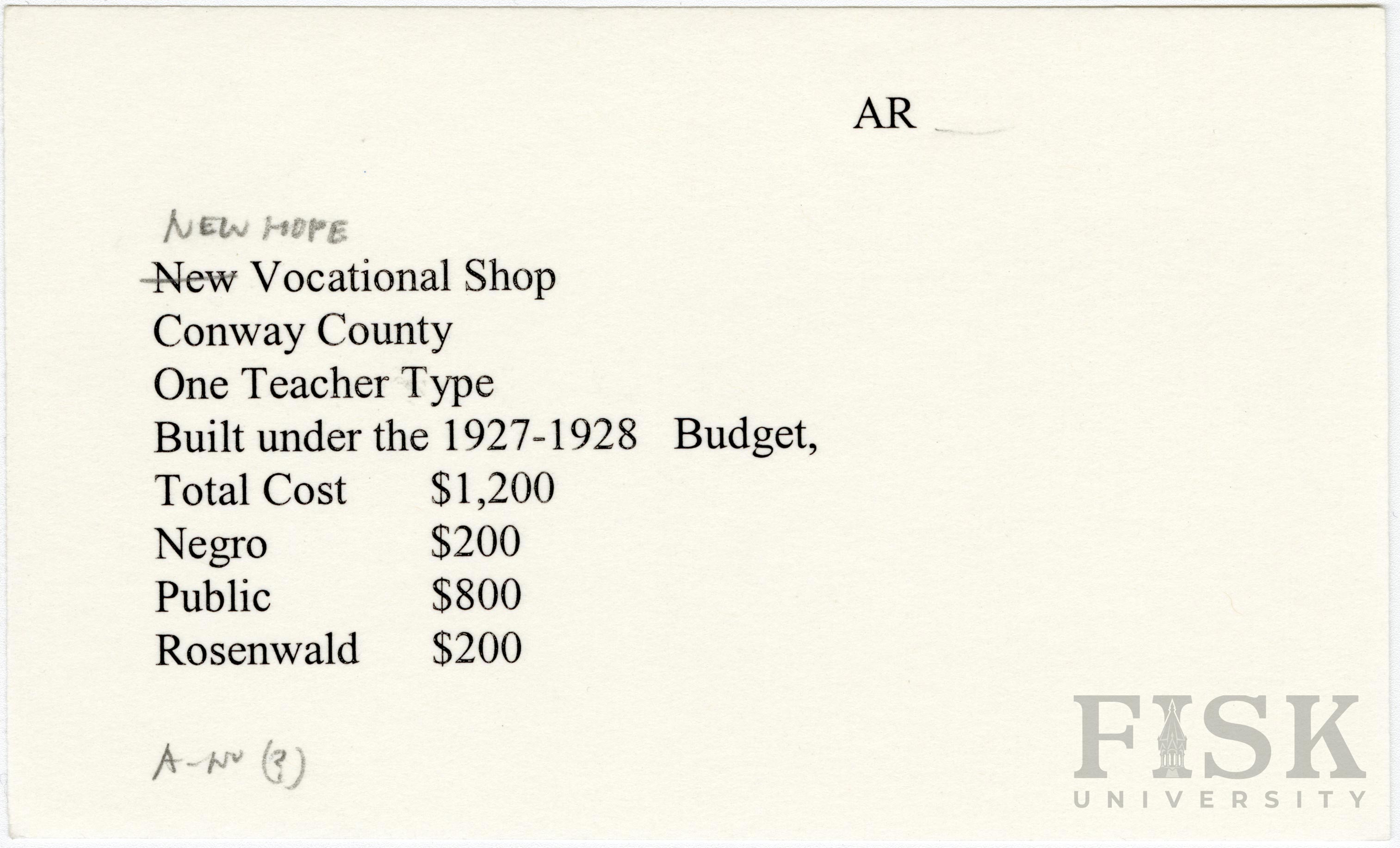 - School card from Rosenwald Fund for the vocational shop at New Hope School in Conway County, Arkansas