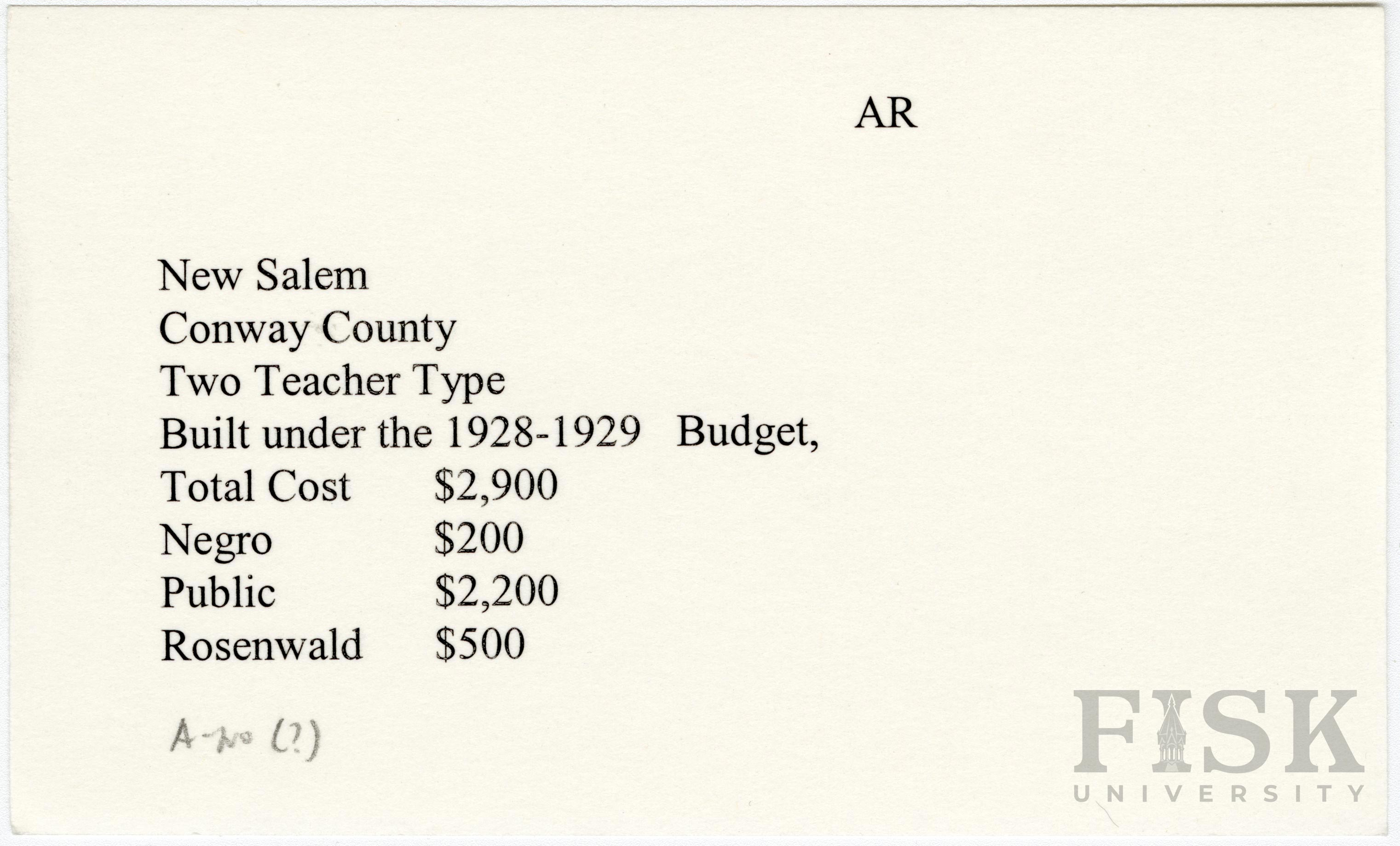 - School card from Rosenwald Fund for New Salem School in Conway County, Arkansas