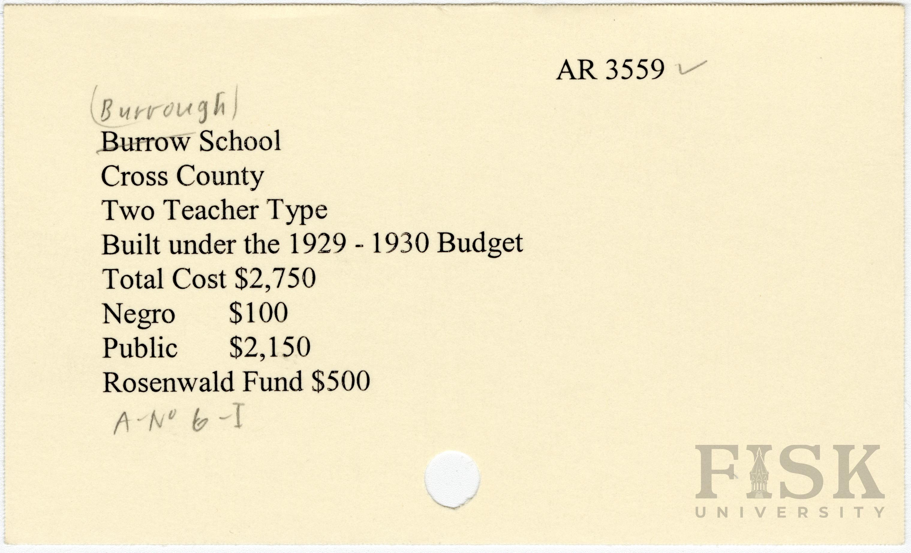 - School card from Rosenwald Fund for Burrough School in Cross County, Arkansas