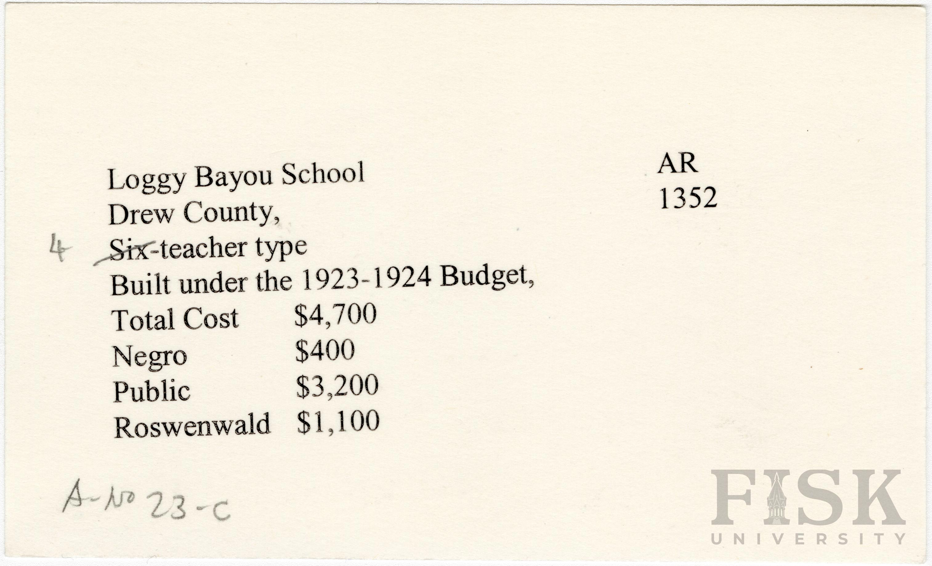 School card from Rosenwald Fund for Loggy Bayou School in Drew County, Arkansas with a handwritten correction to the teacher type section