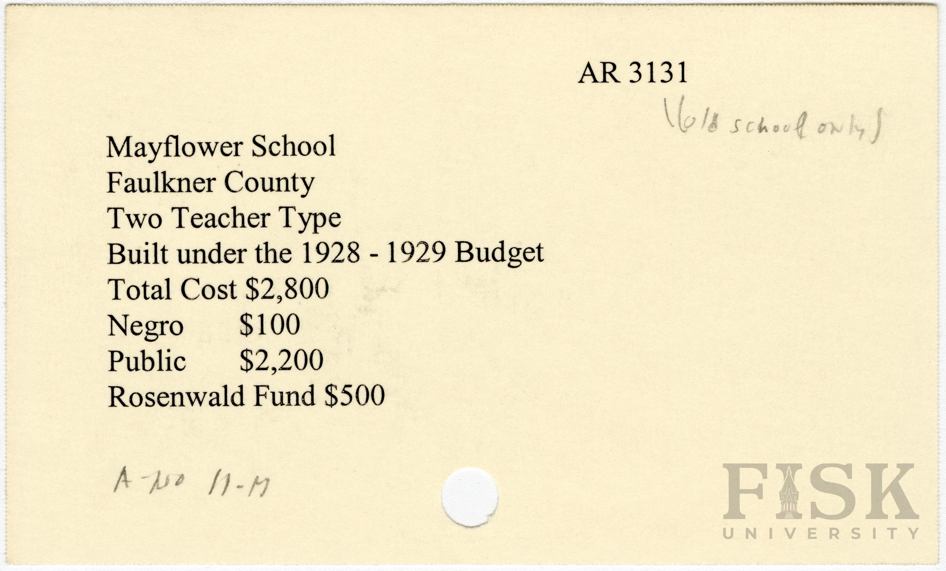 - School card from Rosenwald Fund for Mayflower School in Faulkner County, Arkansas with a note next to the item number that says, "(old school only)"