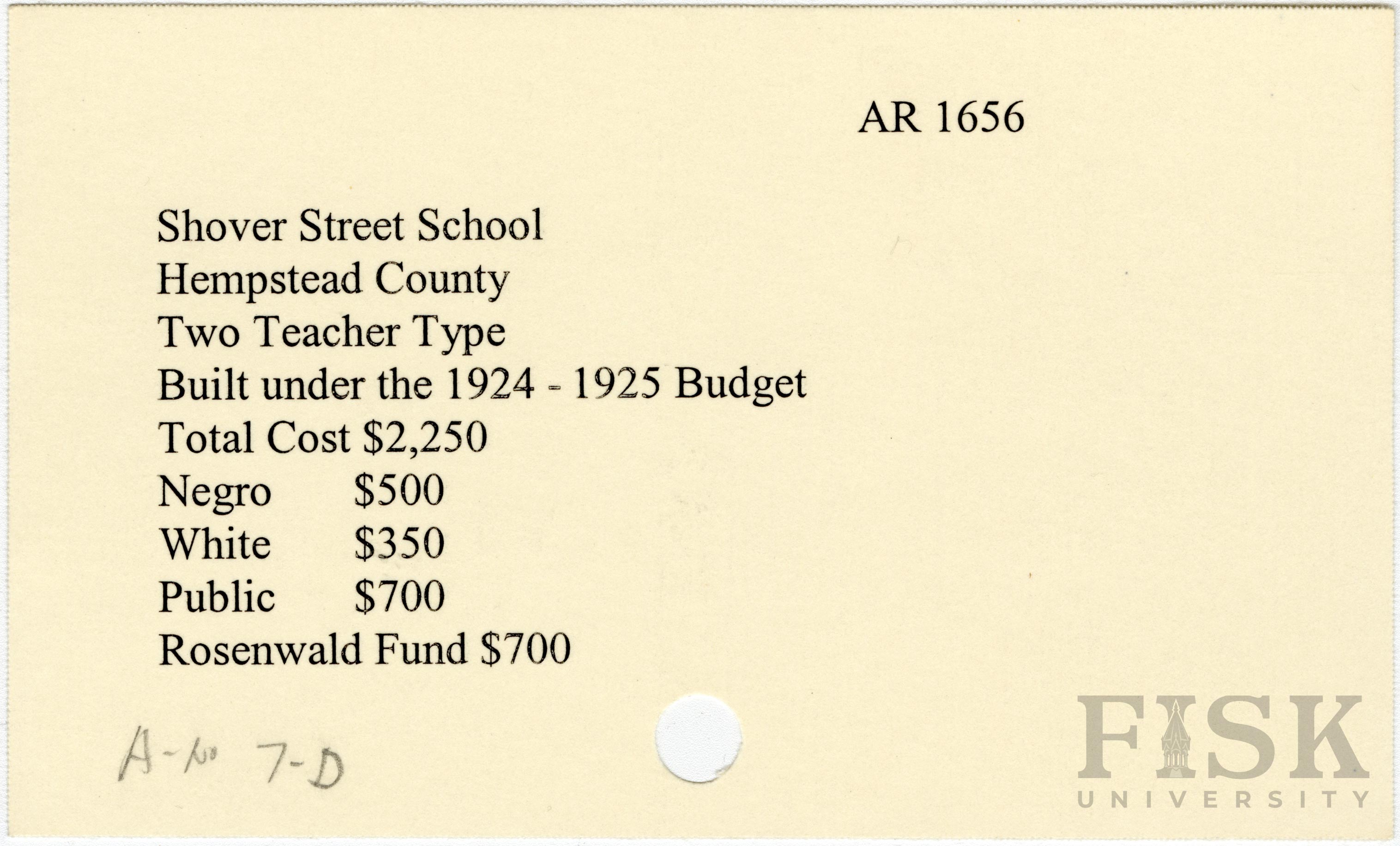 - School card from Rosenwald Fund for Shover Street School in Hempstead County, Arkansas