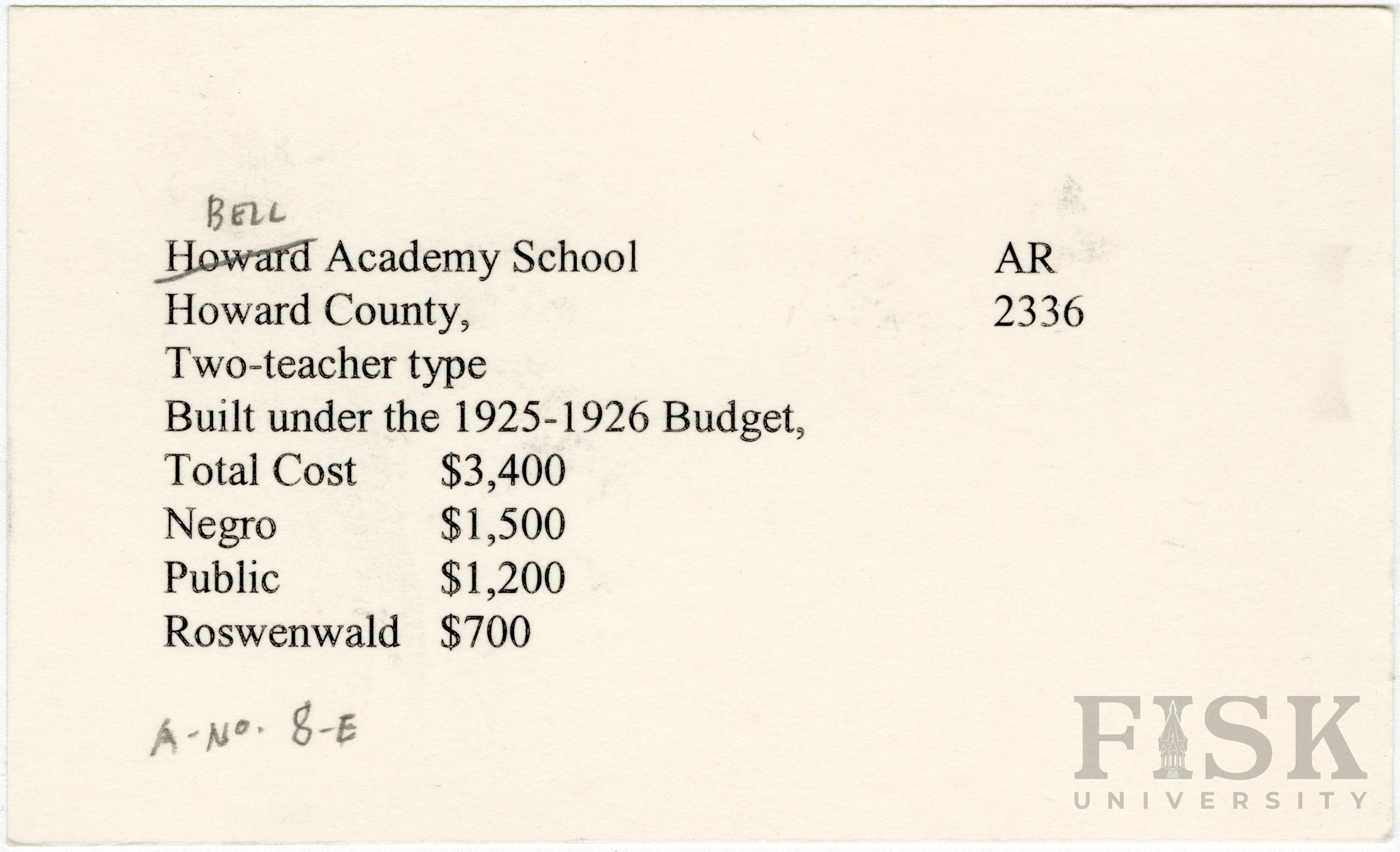 - School card from Rosenwald Fund for Bell Academy School in Howard County, Arkansas