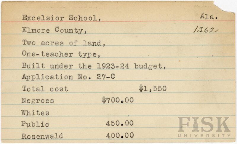 - School card from Rosenwald Fund for Excelsior School in Elmore County, Alabama