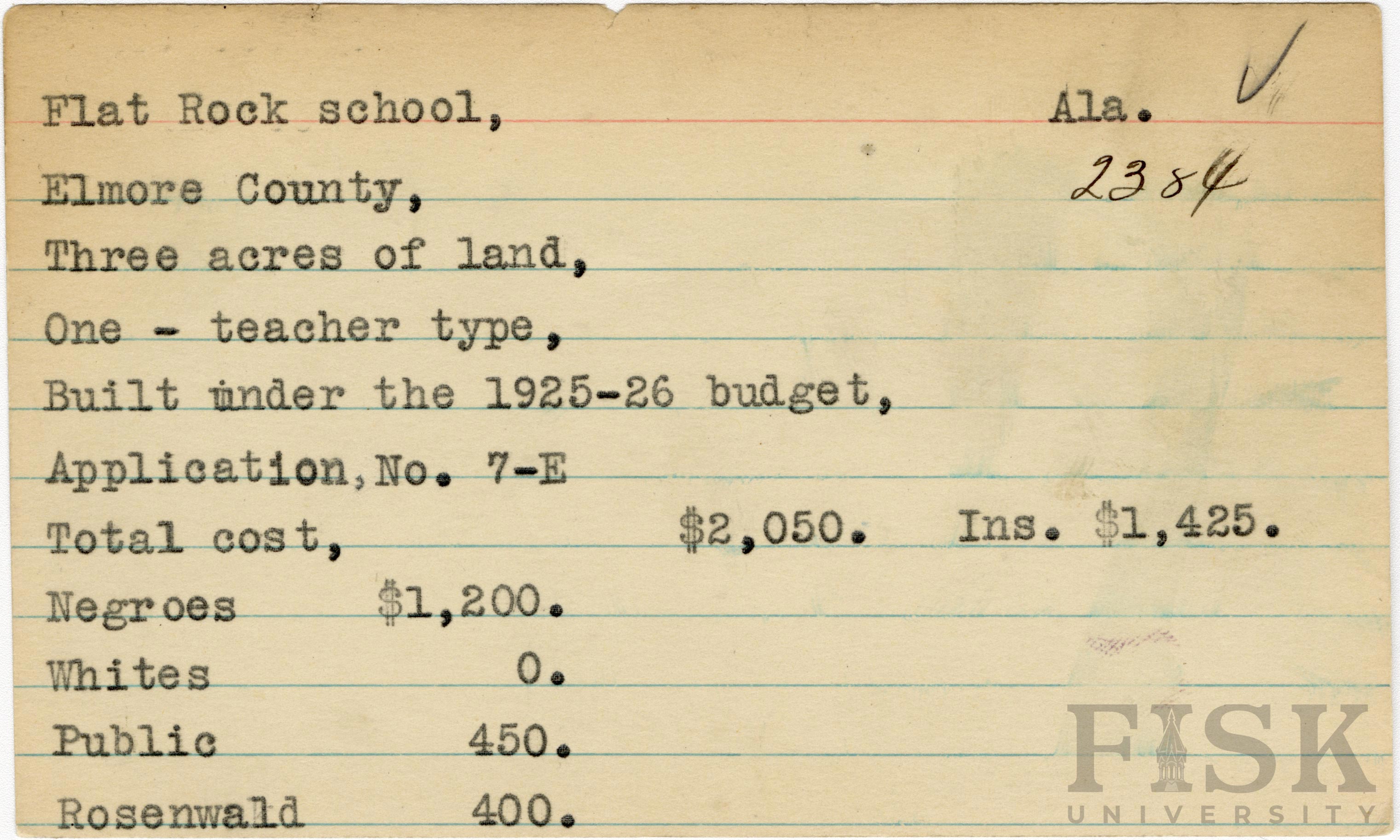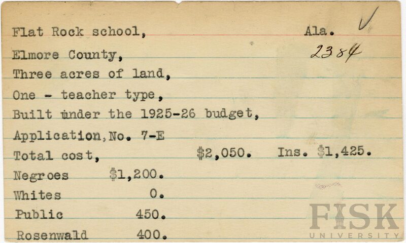 - School card from Rosenwald Fund for Flat Rock School in Elmore County, Alabama with a section added to the budget contributions that says, "Ins. $1,425"