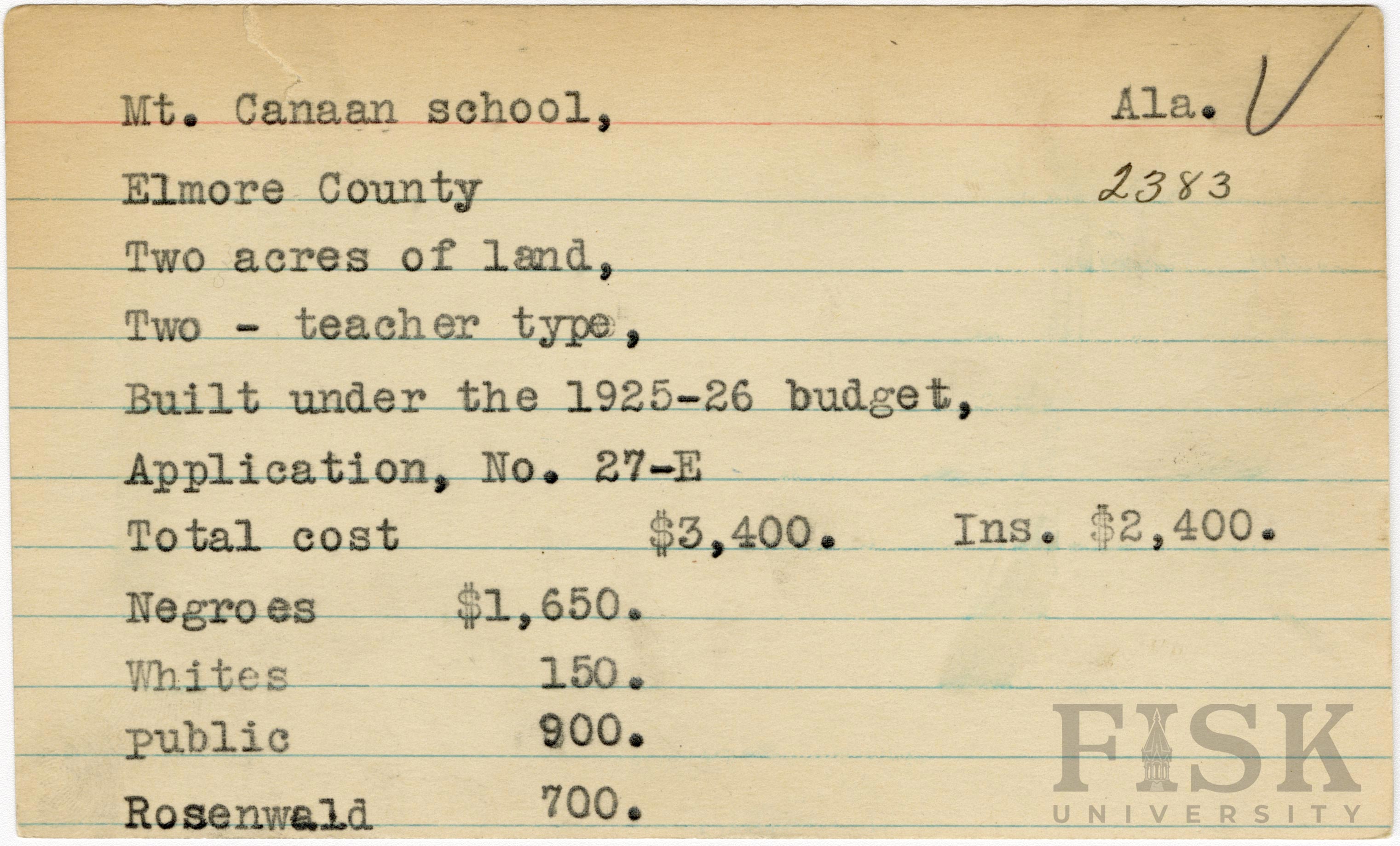 - School card from Rosenwald Fund for Mt. Canaan School in Elmore County, Alabama with a section added in the budget contributions that says, "Ins. $2,400"