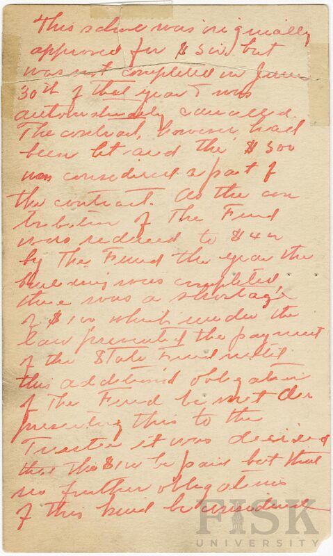 - School card from Rosenwald Fund for Sweetwater School in Elmore County, Alabama with handwritten additions on the front to the budget year, application number, and budget contribution sections, and a handwritten note on the back of the card.