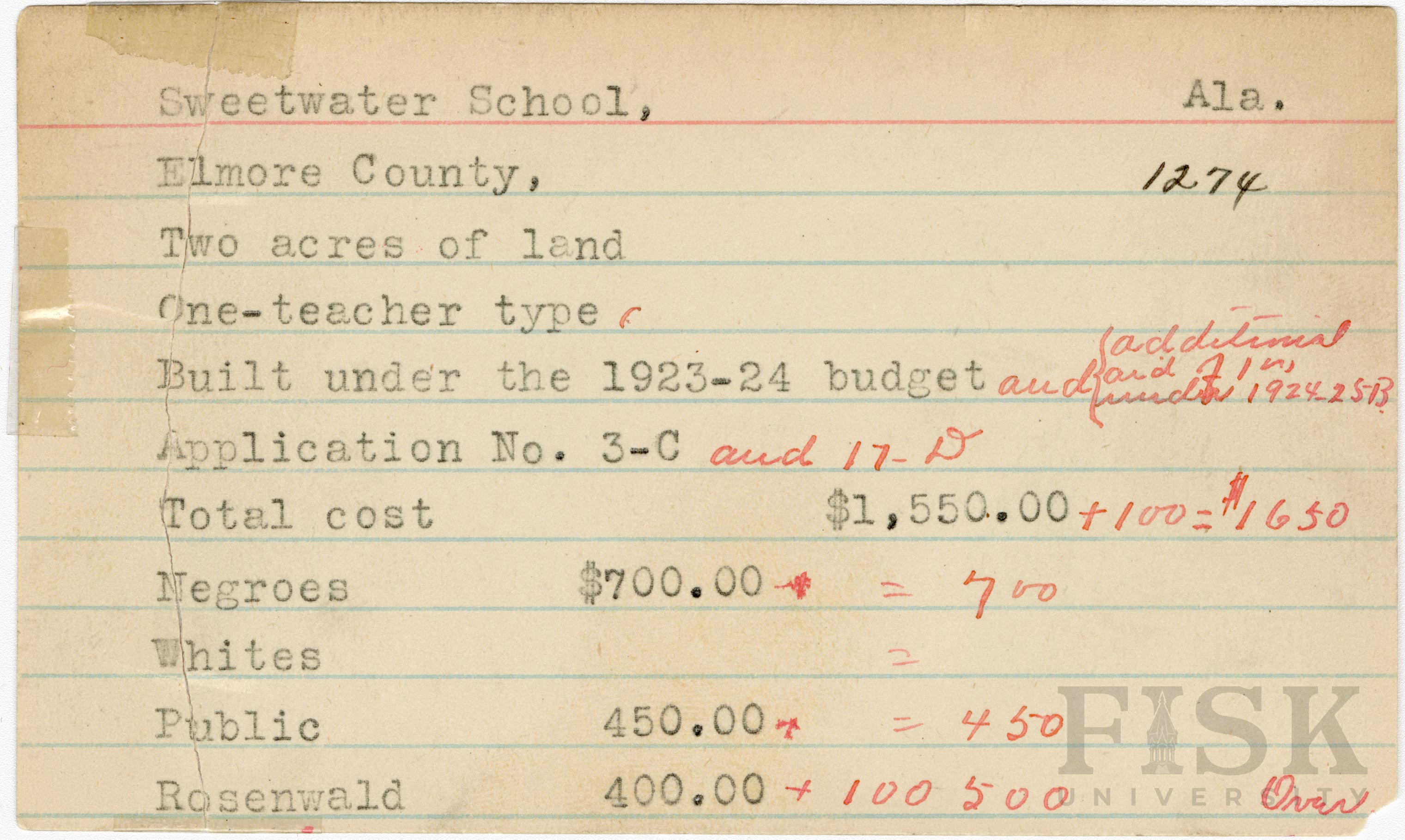 School card from Rosenwald Fund for Sweetwater School in Elmore County, Alabama with handwritten additions on the front to the budget year, application number, and budget contribution sections, and a handwritten note on the back of the card.