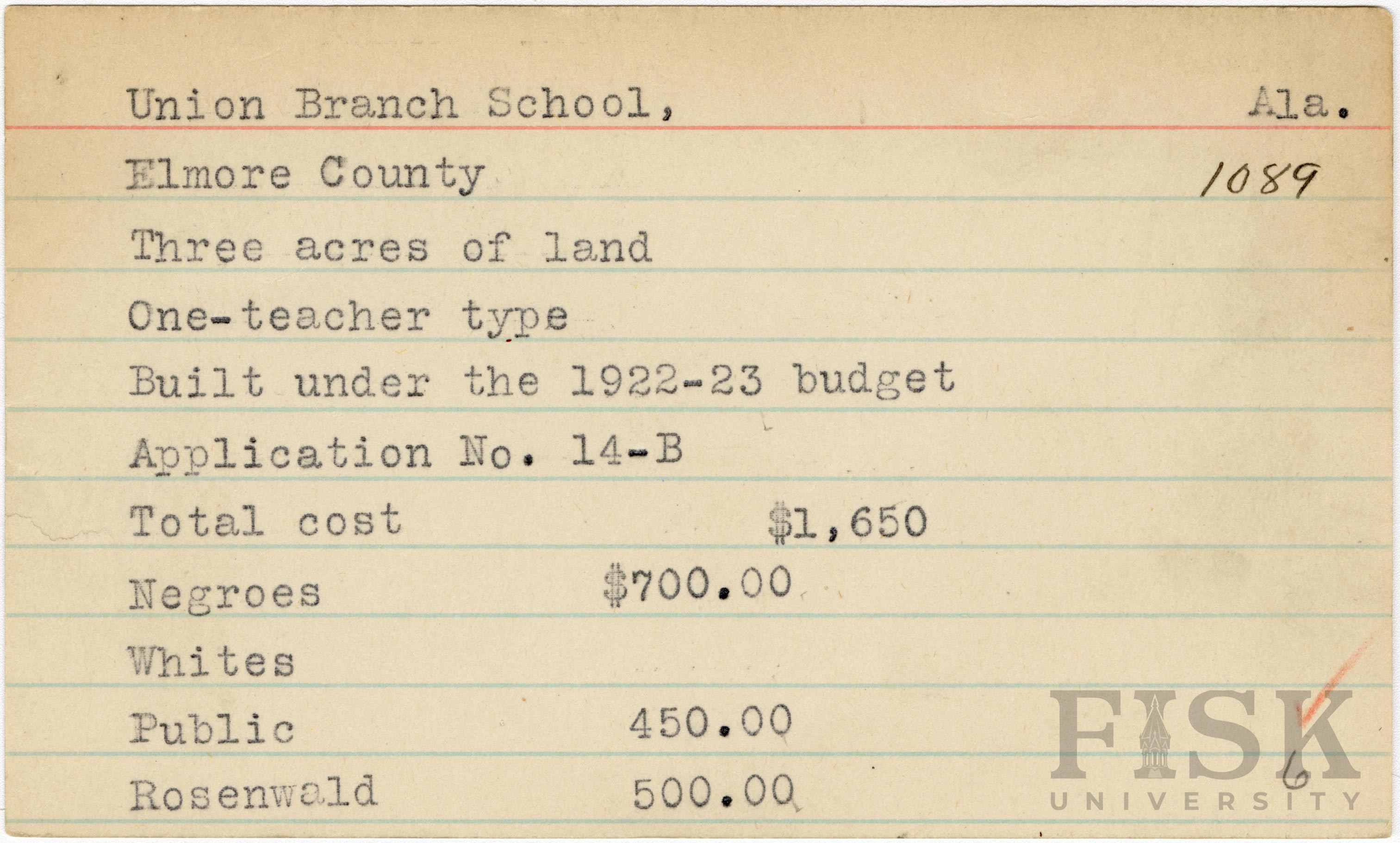 - School card from Rosenwald Fund for Union Branch School in Elmore County, Alabama