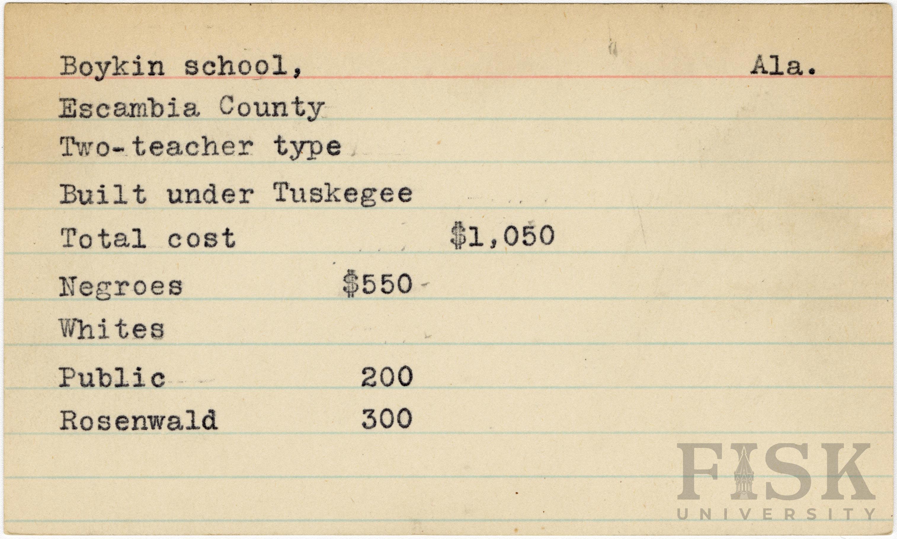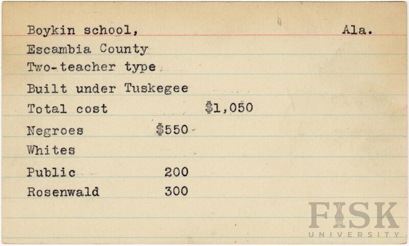 - School card from Rosenwald Fund for Boykin School in Escambia County, Alabama