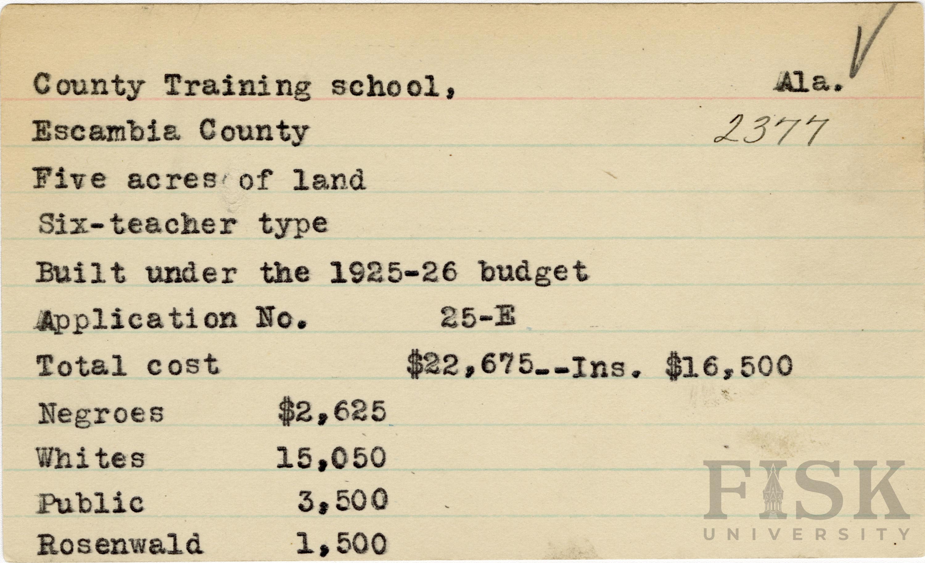 School card from Rosenwald Fund for County Training School in Escambia County, Alabama with a section added to the budget contributions that says, "Ins. $16,500"