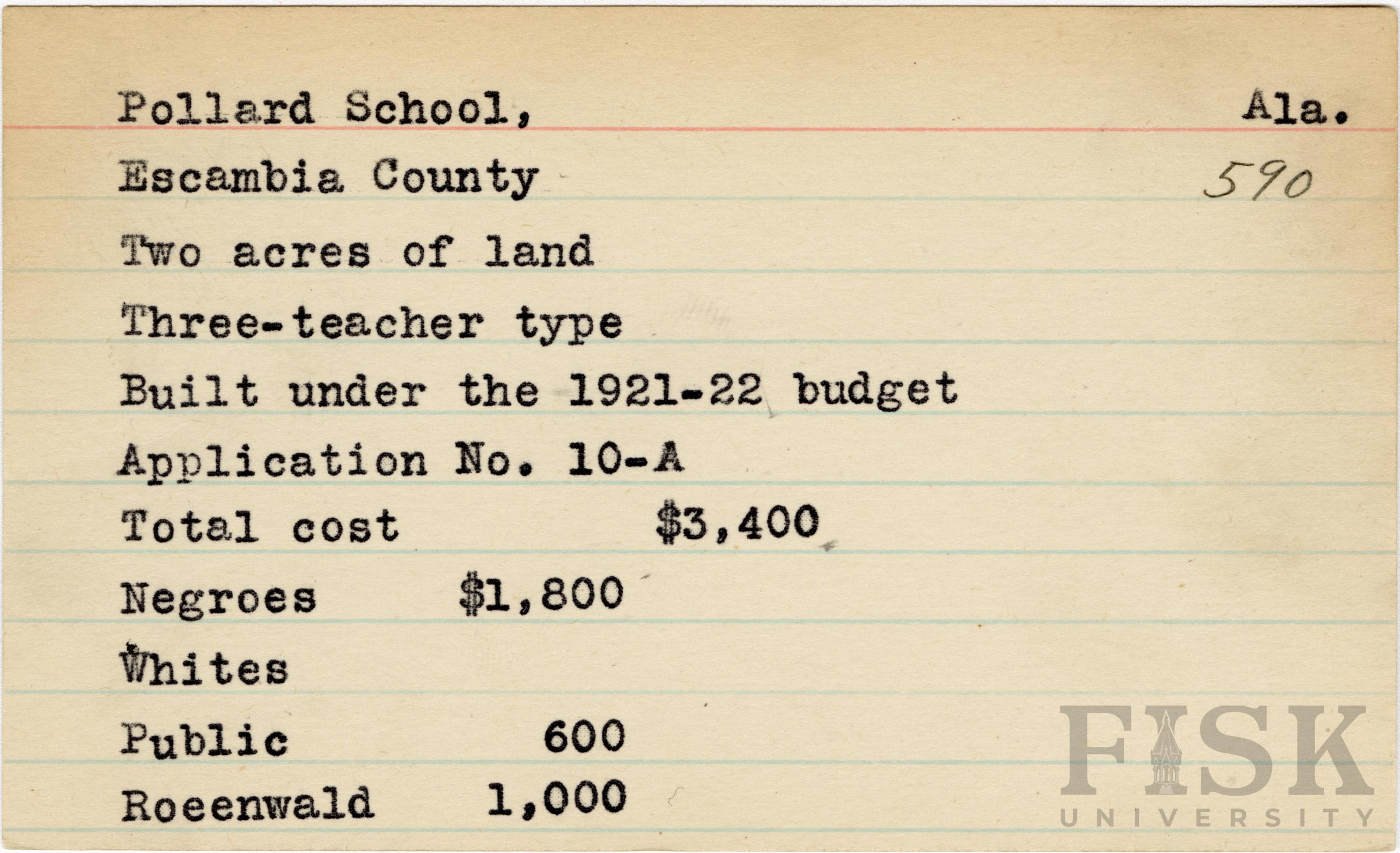 - School card from Rosenwald Fund for Pollard School in Escambia County, Alabama