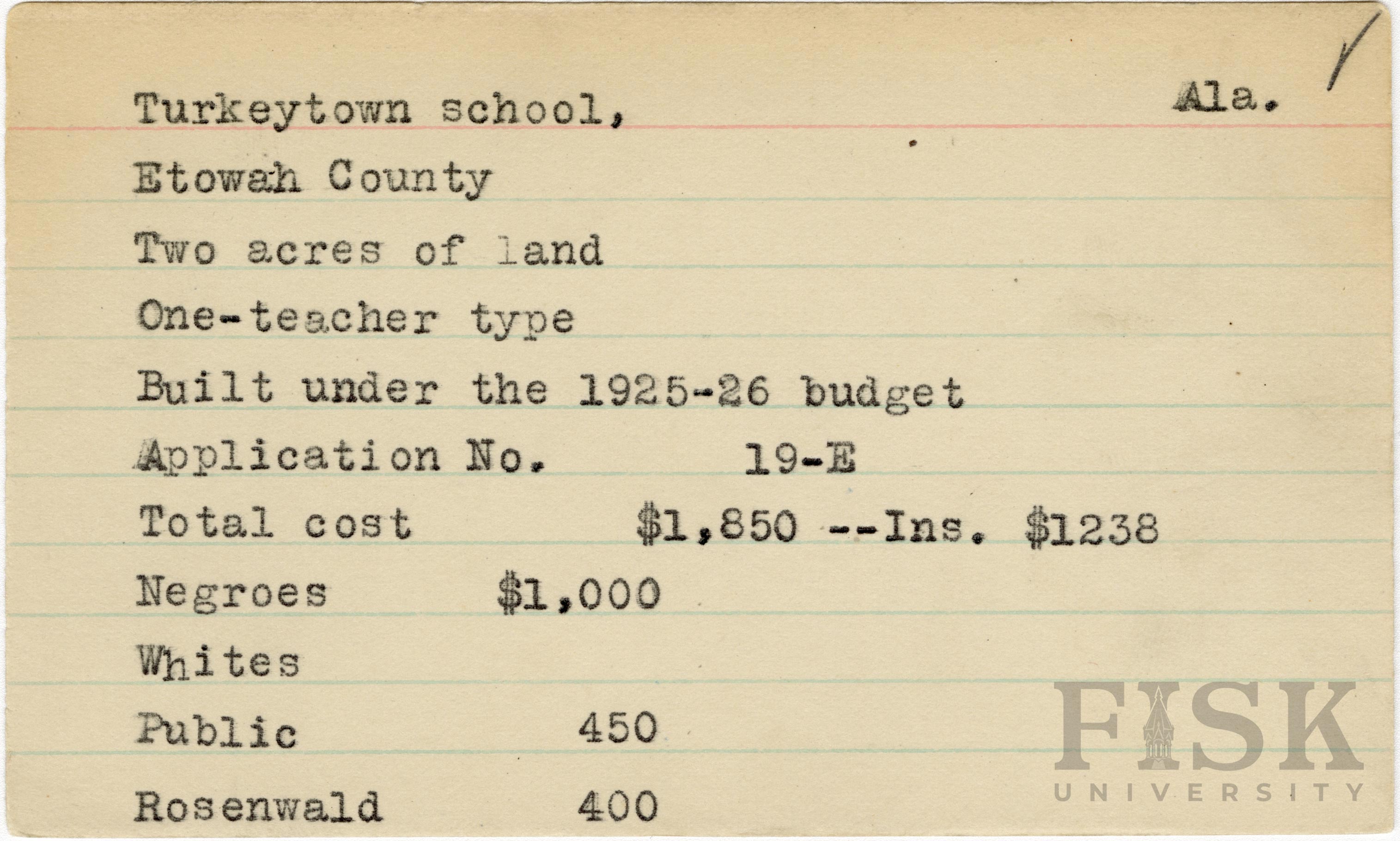 School card from Rosenwald Fund for Turkeytown School in Etowah County, Alabama with a section added to the budget contributions that says, "Ins. $1,238"