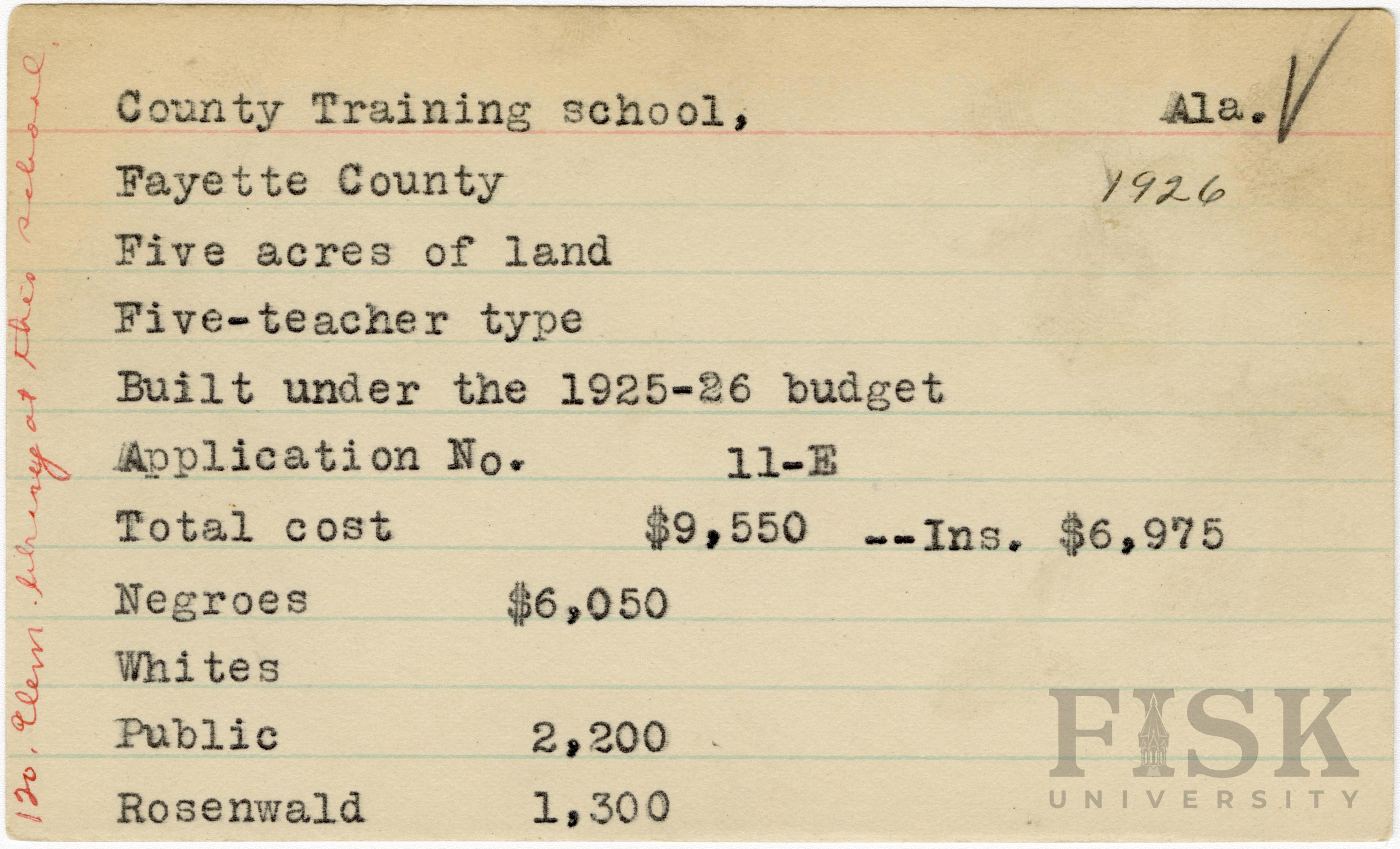 - School card from Rosenwald Fund for County Training School in Fayette County, Alabama with a section added to the budget contributions that says, "Ins. $6,975"