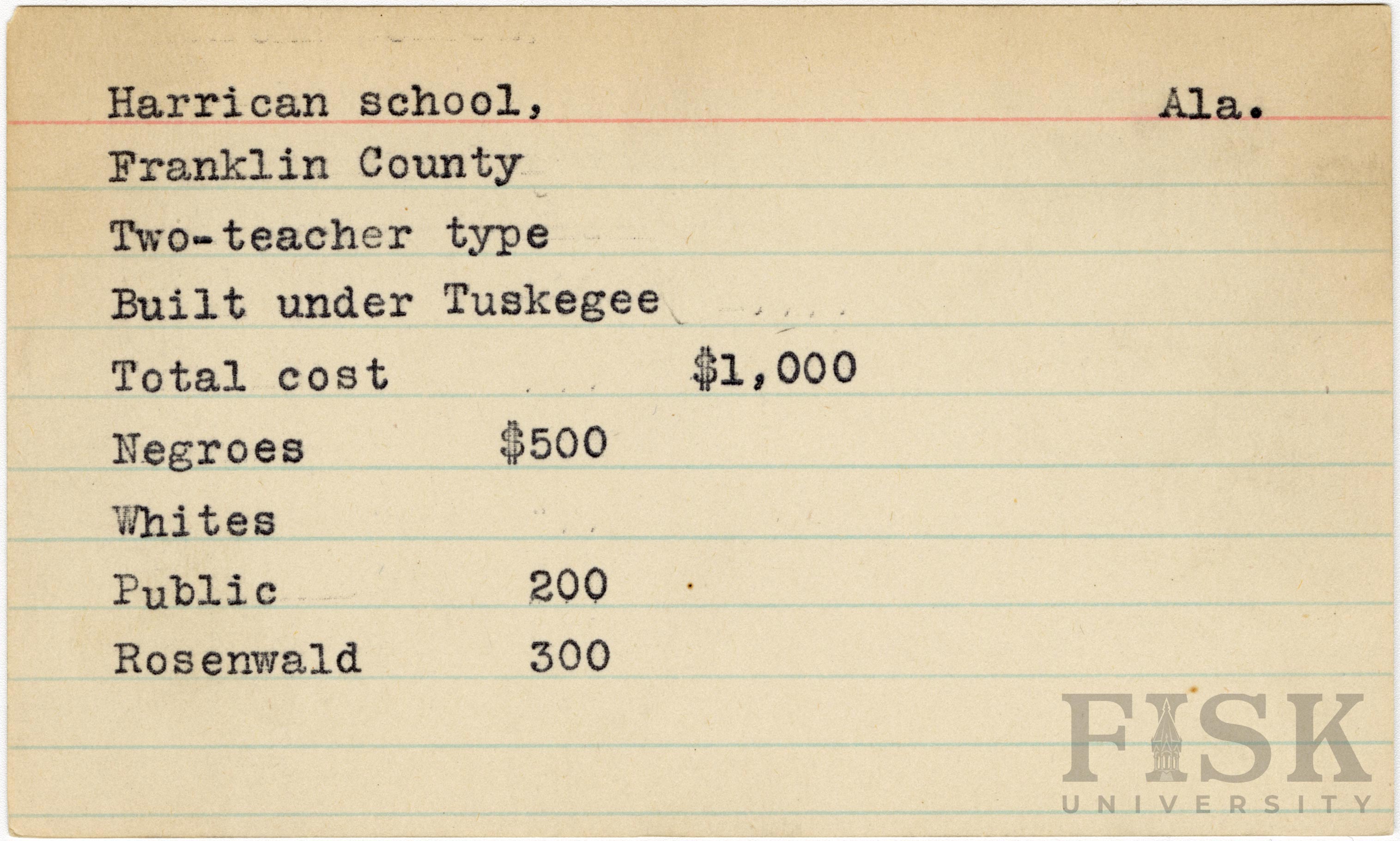 - School card from Rosenwald Fund for Harrican School in Franklin County, Alabama