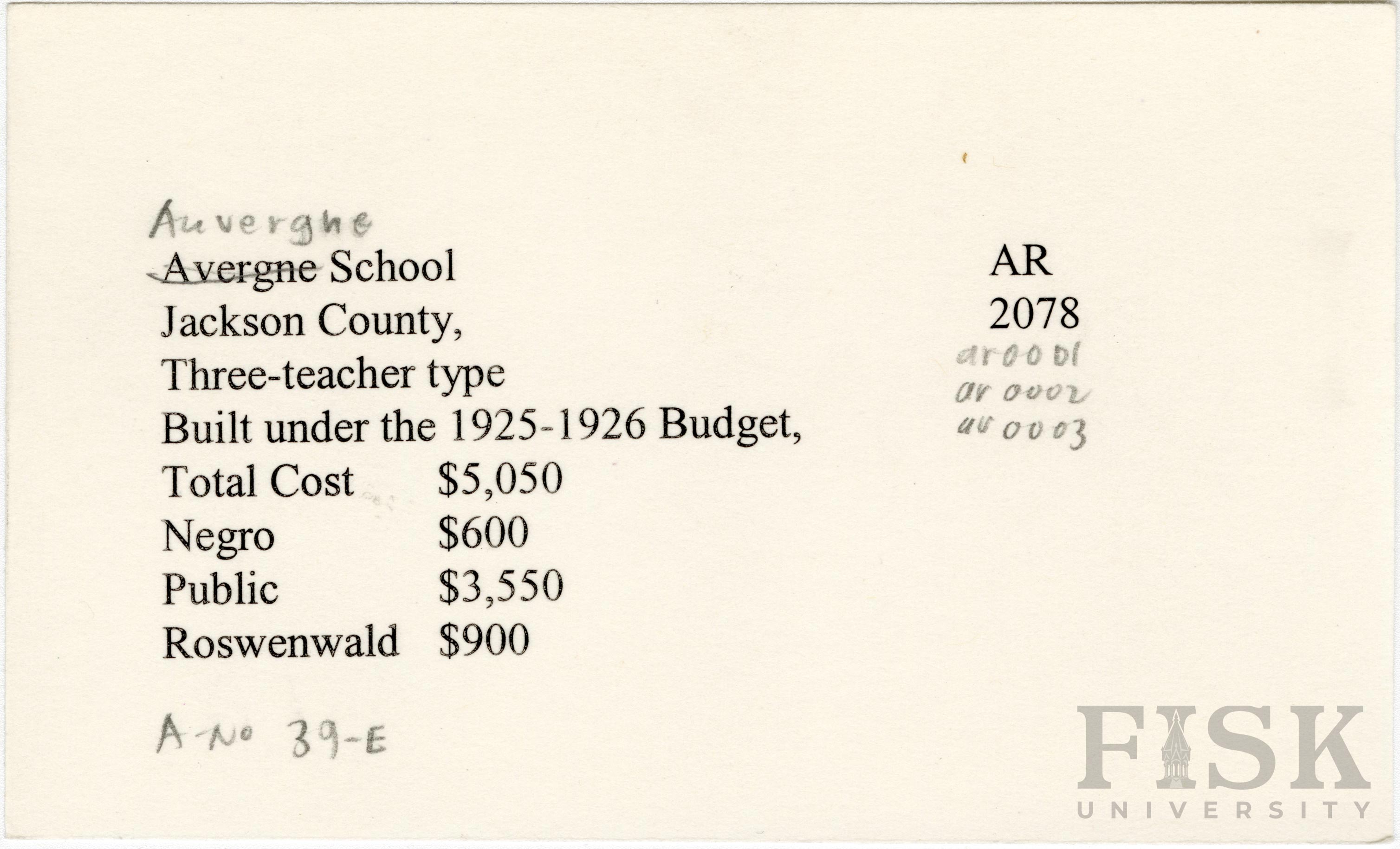 - School card from Rosenwald Fund for Auvergne School in Jackson County, Arkansas