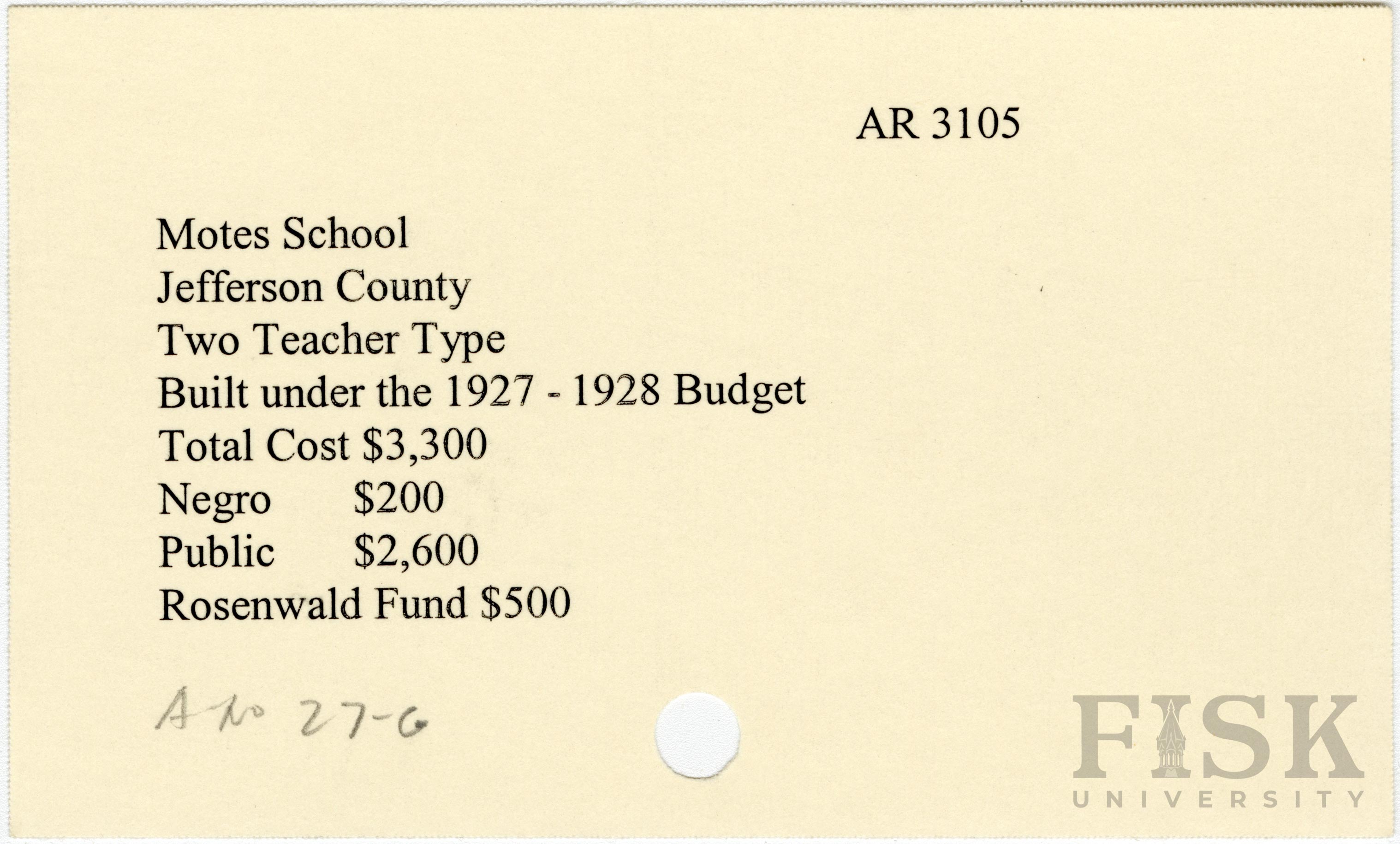 - School card from Rosenwald Fund for Motes School in Jefferson County, Arkansas