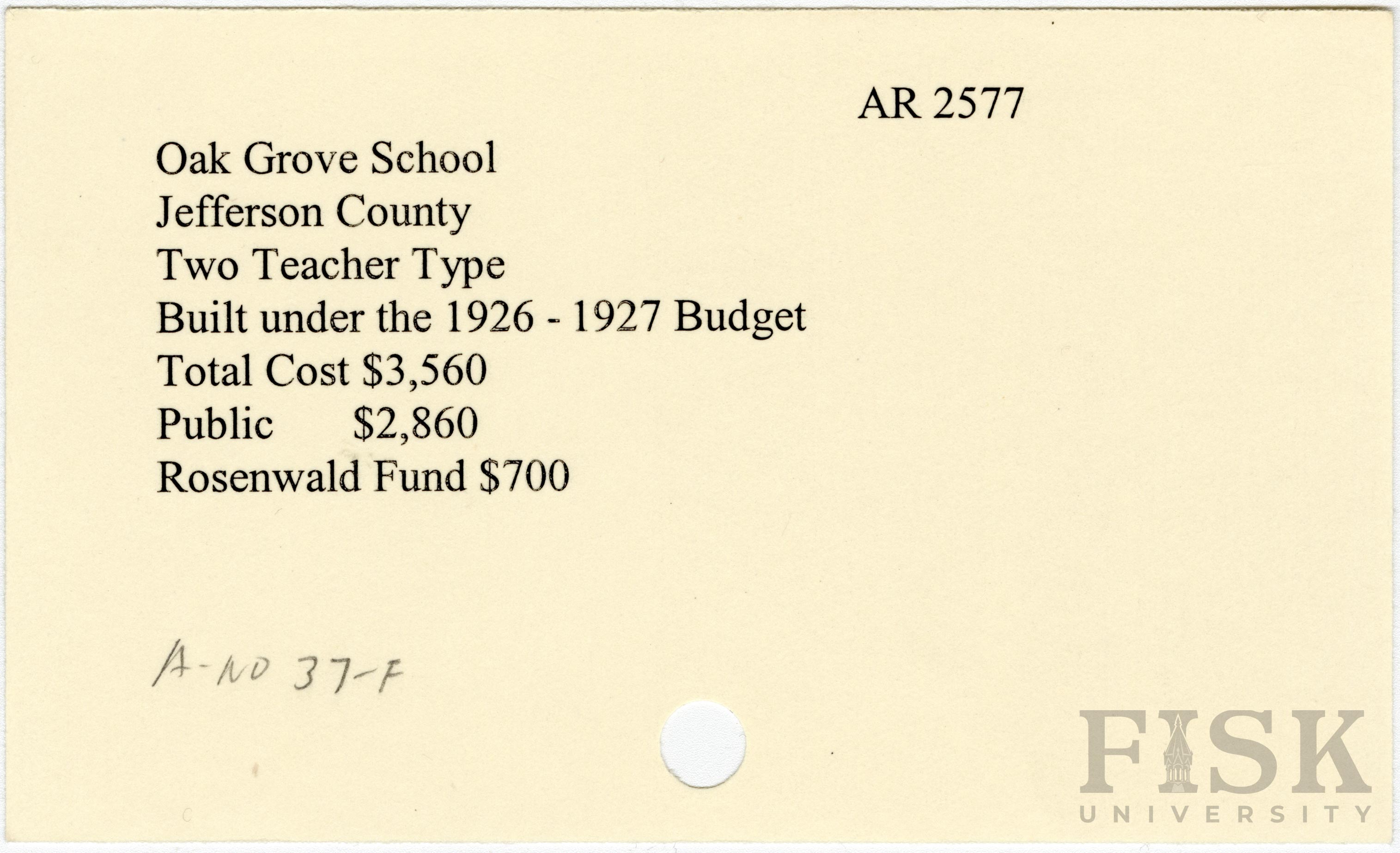 - School card from Rosenwald Fund for Oak Grove School in Jefferson County, Arkansas