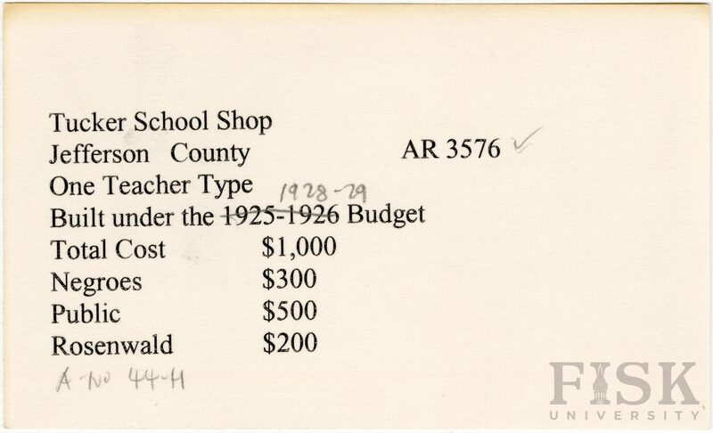 - School card from Rosenwald Fund for the vocational shop at Tucker School in Jefferson County, Arkansas with a handwritten correction to the budget year section