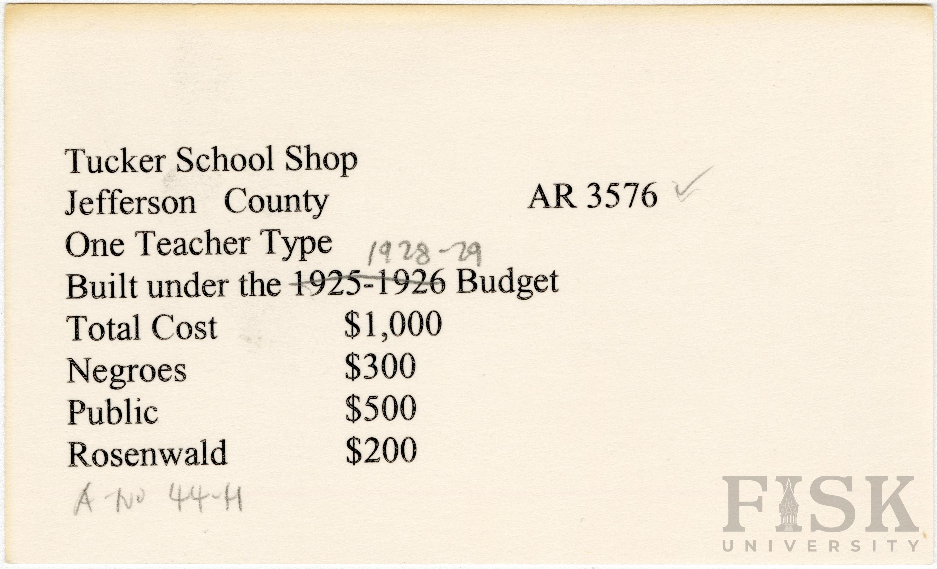 School card from Rosenwald Fund for the vocational shop at Tucker School in Jefferson County, Arkansas with a handwritten correction to the budget year section