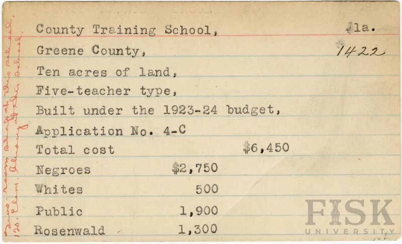- School card from Rosenwald Fund for County Training School in Greene County, Alabama with a note in red on the far left of the card