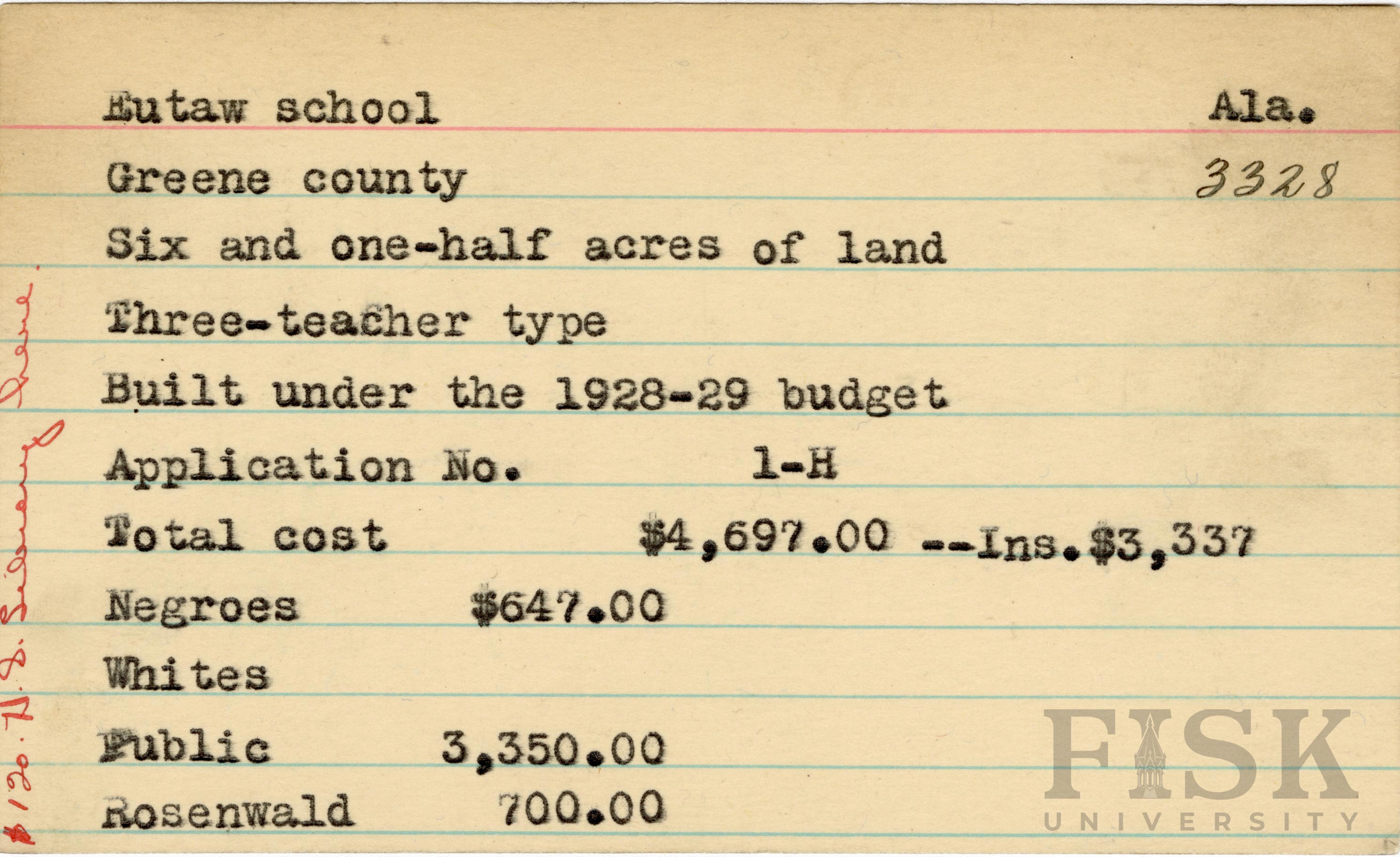 School card from Rosenwald Fund for Eutaw School in Greene County, Alabama with a section added to the budget contributions that says, "Ins. $3,337" and a handwritten note in red on the far left of the card.