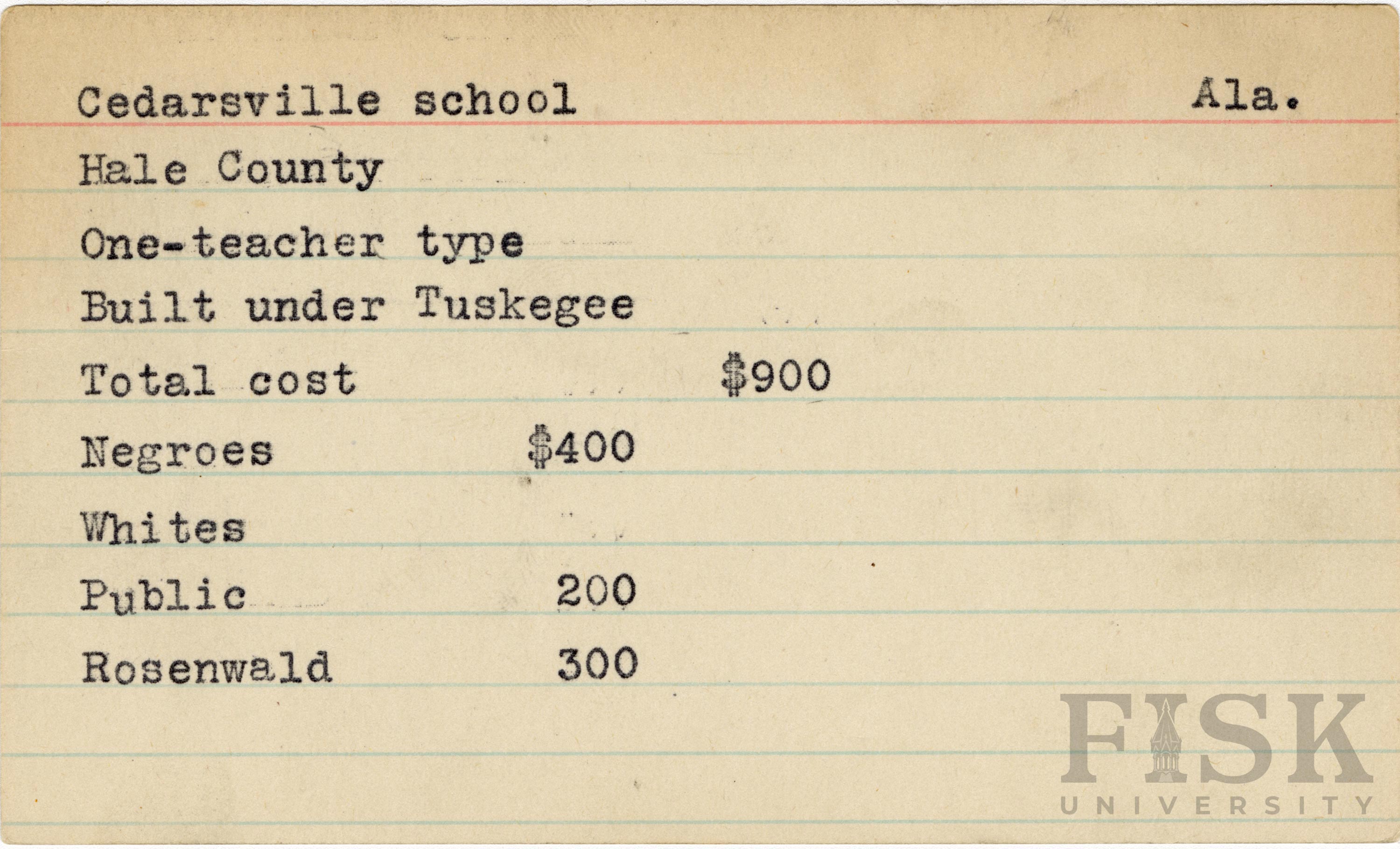 - School card from Rosenwald Fund for Cedarsville School in Hale County, Alabama