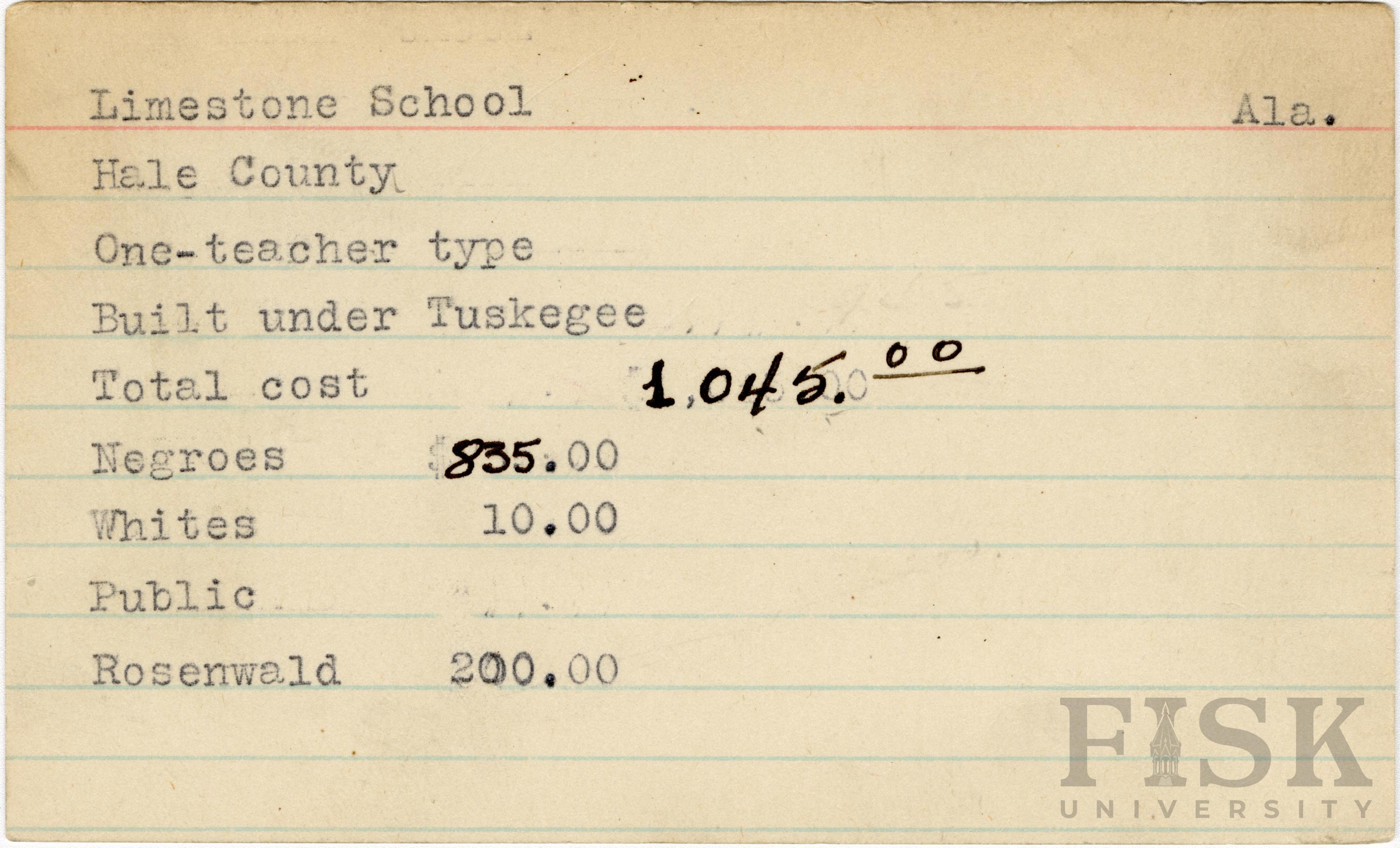 - School card from Rosenwald Fund for Limestone School in Hale County, Alabama