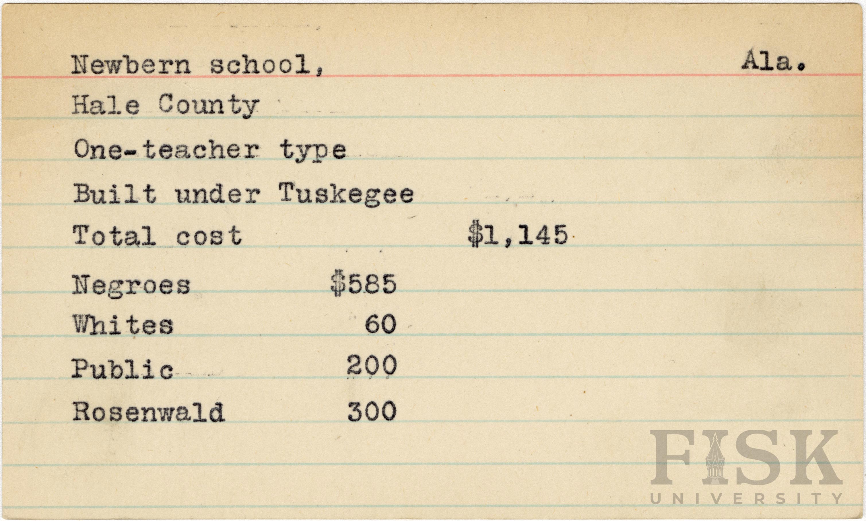 - School card from Rosenwald Fund for Newbern School in Hale County, Alabama